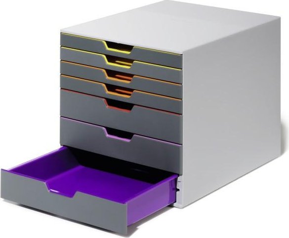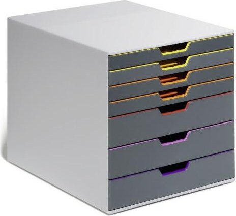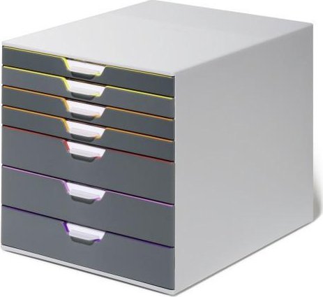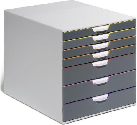 Atractiva e innovadora cajonera con 7 cajones de colores realizada en plástico de alta calidad. Los frontales de color ayudan a organizar la información cuando la cajonera está cerrada. Cajones de fácil extracción con cierre de seguridad. Admite información tamaño A4, C4, folio y carta. Incluye etiquetas que se pueden imprimir por ordenador. Apilable sobre apoyos de goma. Diseñada para encajar en todo tipo de armarios estándar. Medidas: 292 x 280 x 356 mm (An x Al x P)