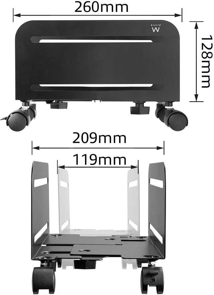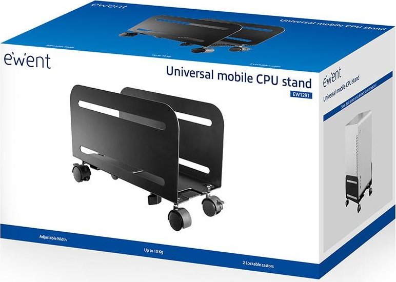 Ewent EW1291. Tipo: Carro para equipo informático, Tipo de chasis recomendado: Universal, Capacidad máxima de peso: 10 kg. Anchura de ordenador admitida (vertical) (mín.): 12 cm, Anchura de ordenador admitida (vertical) (máx.): 21 cm. Ancho: 209 mm, Rango de ajuste a anchura: 119 - 209 mm, Profundidad: 260 mm