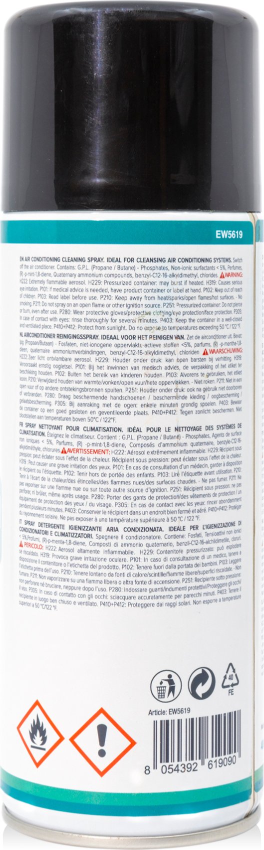El Spray de limpieza de aire acondicionado Ewent EW5619 es un aerosol de espuma activa con una mezcla a base de agua e inhibidores de corrosión añadidos por propulsor (mezcla de G.P.L.). Limpia el aire acondicionado y neutraliza los olores.