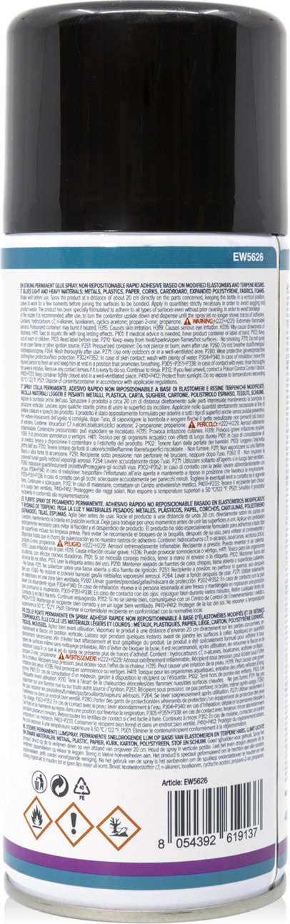 El Ewent EW5626 Permanent Glue Spray es un adhesivo de secado rápido no reposicionable basado en elastómeros modificados y resinas terpénicas. Pega materiales ligeros y pesados: metales, plásticos, papel, corchos, cartón, poliestireno expandido, telas, espumas.