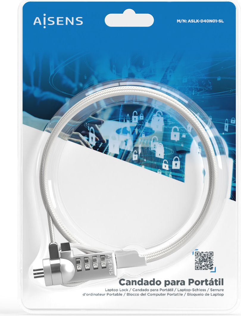 AISENS Cable de Seguridad con Cerradura de Combinacion para Ordenador, Monitor, Portatil 1.5M. Color del producto: Plata, Mejores usos: Monitor, Portátil, PC, Tipo de candado: Cerradura con combinación. Longitud de cable: 1,5 m, Diámetro de cable: 4 mm, Ancho: 57 mm. Cantidad por paquete: 1 pieza(s), Ancho del paquete: 153 mm, Profundidad del paquete: 25 mm. Ancho de la caja principal: 350 mm, Longitud de la caja: 525 mm, Alto de la caja principal: 450 mm