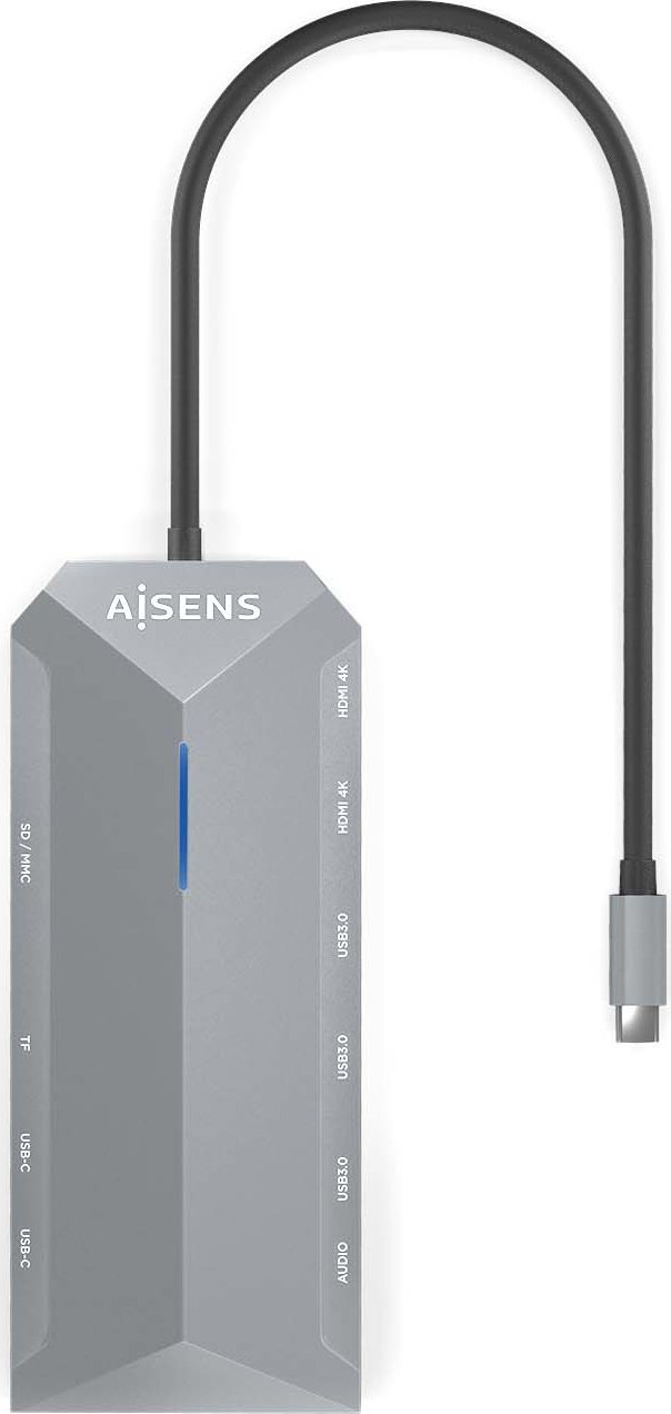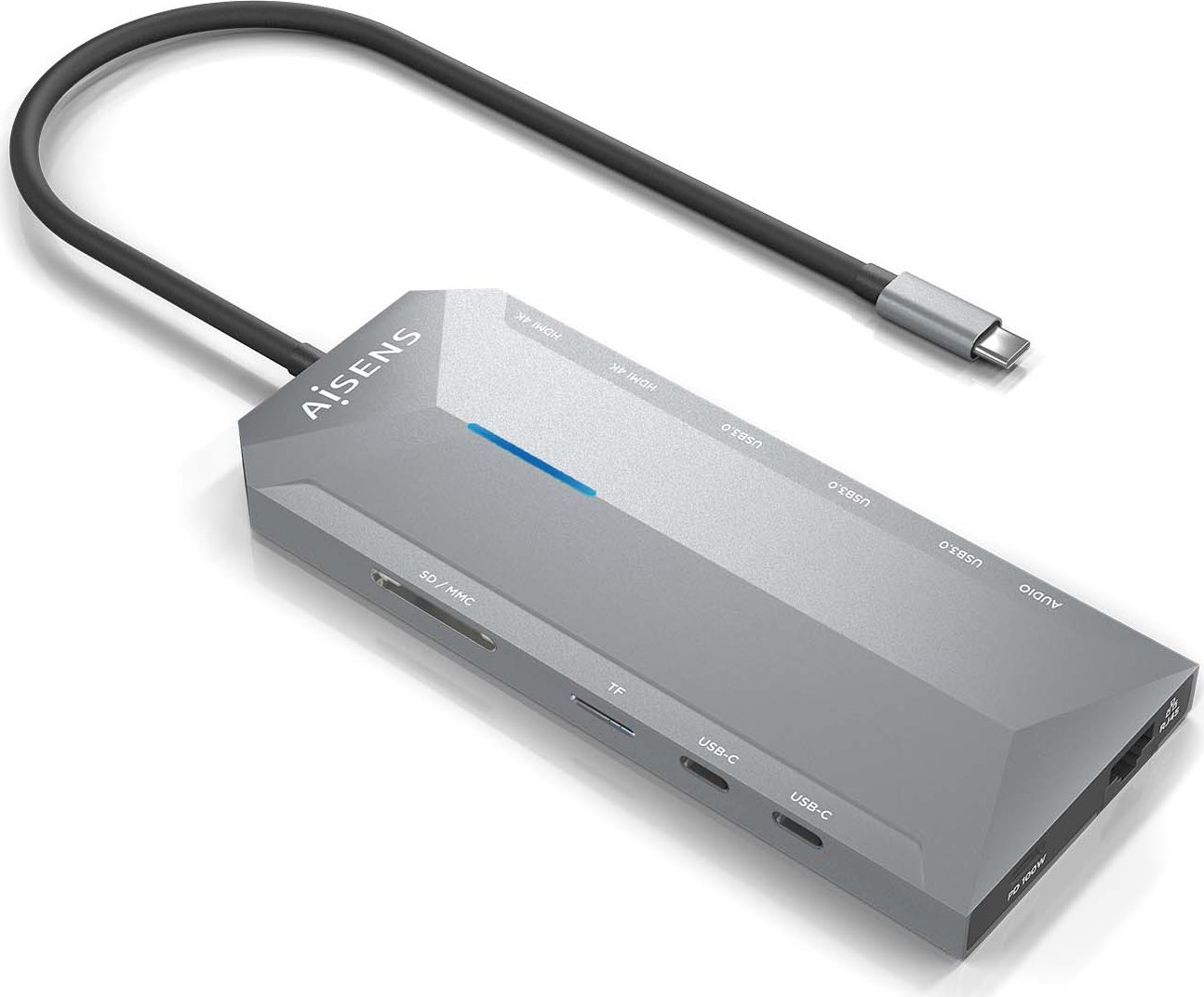 AISENS USB-C Dock 12 En 1, USB-C A 2xHDMI, 1xRJ45, 3xUSB-A, 2xUSB-C, 1xUSB-C PD, 1xAudio, 1xSD, 1xMicro SD, Gris, 30cm. Tecnología de conectividad: Alámbrico, Interfaz de host: USB 3.2 Gen 1 (3.1 Gen 1) Type-C, Entrega de energía USB (USB Power Delivery) de hasta: 100 W. Ethernet LAN, velocidad de transferencia de datos: 10,100,1000 Mbit/s, Estándares de red: IEEE 802.3, IEEE 802.3ab, IEEE 802.3az, IEEE 802.3u, IEEE 802.3x. Color del producto: Gris, Tarjetas de memoria compatibles: MicroSD (TransFlash), MicroSDHC, MicroSDXC, RS-MMC, SD, SDHC, SDXC, Velocidad de transferencia de datos: 5 Gbit/s. Longitud del cable USB: 0,3 m. Sistema operativo Windows soportado: Windows 10, Windows 11, Sistema operativo MAC soportado: Mac OS X 10.10 Yosemite, Mac OS X 10.11 El Capitan, Mac OS X 10.12 Sierra, Mac OS X 10.13 High..., Sistemas operativos móviles soportados: iPadOS