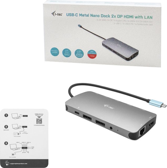 i-tec Metal USB-C Nano 3x Display Docking Station + Power Delivery 100 W. Tecnología de conectividad: Alámbrico, Interfaz de host: USB 3.2 Gen 1 (3.1 Gen 1) Type-C, Entrega de energía USB (USB Power Delivery) de hasta: 100 W. Ethernet LAN, velocidad de transferencia de datos: 10,100,1000 Mbit/s. Color del producto: Plata. Otros sistemas operativos soportados: Android. Ancho: 127 mm, Profundidad: 60 mm, Altura: 19 mm