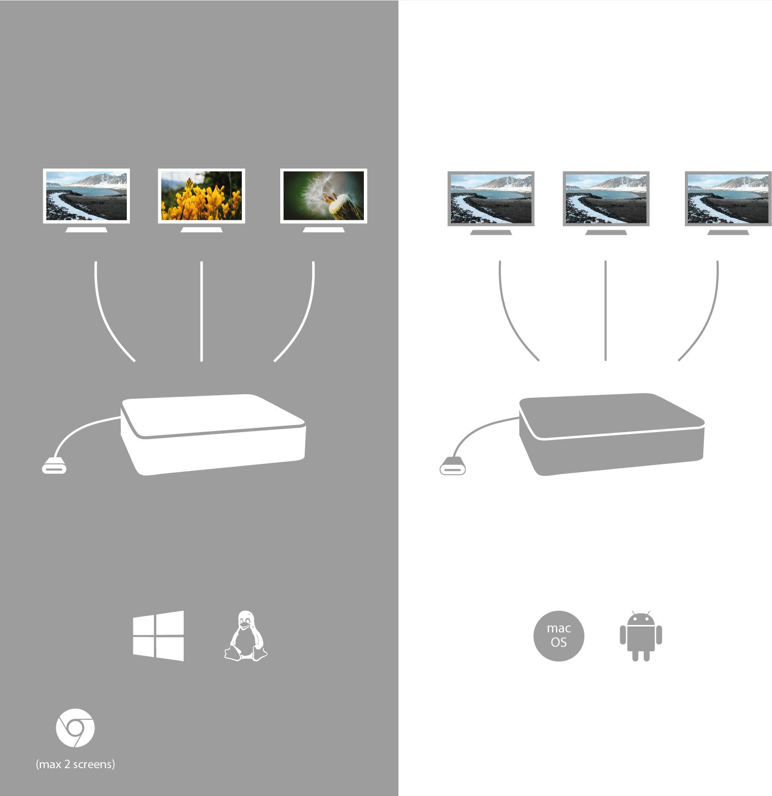 Nota: macOS no es compatible con la tecnología Multi Stream Transport (MST), lo que significa que cuando se conecta a un dispositivo que ejecuta macOS, todos los monitores externos conectados mostrarán la misma imagen.