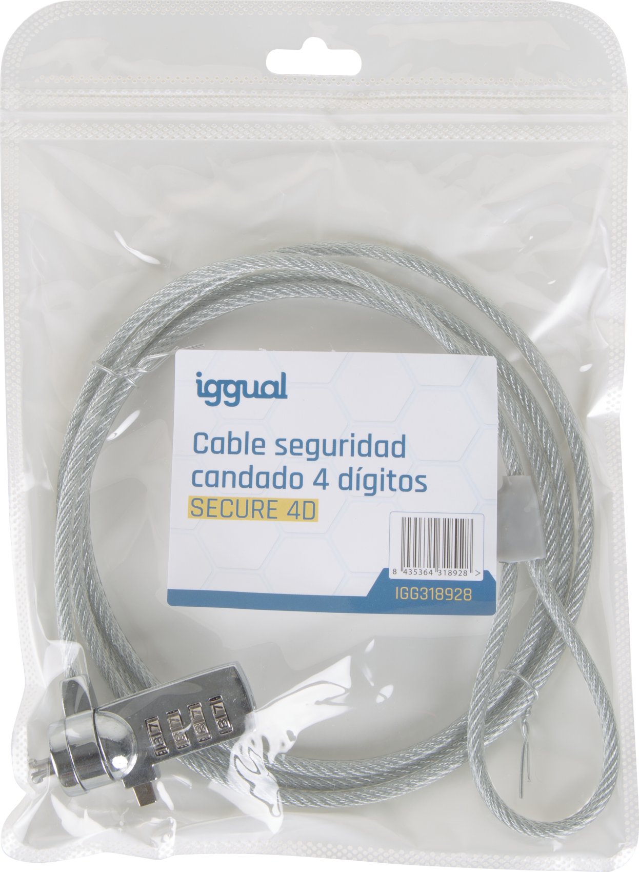 iggual Secure 4D. Color del producto: Plata, Mejores usos: Universal, Tipo de candado: Cerradura con combinación. Longitud de cable: 1,5 m, Diámetro de cable: 4 mm. Cantidad por paquete: 1 pieza(s)