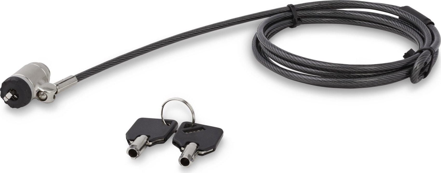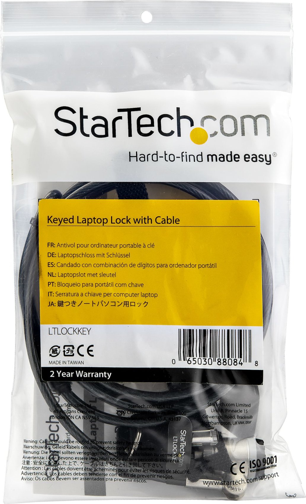 StarTech.com Candado con Cable para Portátil - con Traba de Ranura (Tipo K) - con Llave. Color del producto: Negro, Plata, Mejores usos: Portátil, Tipo de candado: 2 llaves. Certificados de sostenibilidad: CE, RoHS. Longitud de cable: 2 m, Ancho: 32 mm, Altura: 17 mm. Cantidad por paquete: 1 pieza(s), Ancho del paquete: 4 mm, Profundidad del paquete: 130 mm. Ancho de la caja principal: 290 mm, Longitud de la caja: 320 mm, Alto de la caja principal: 237 mm