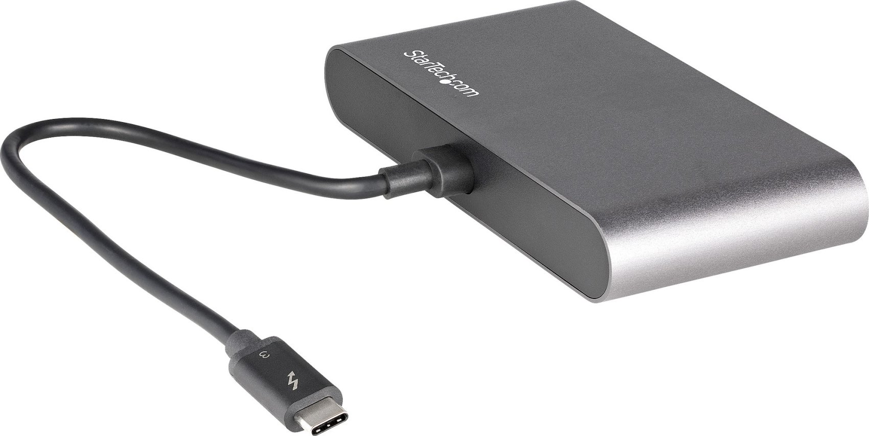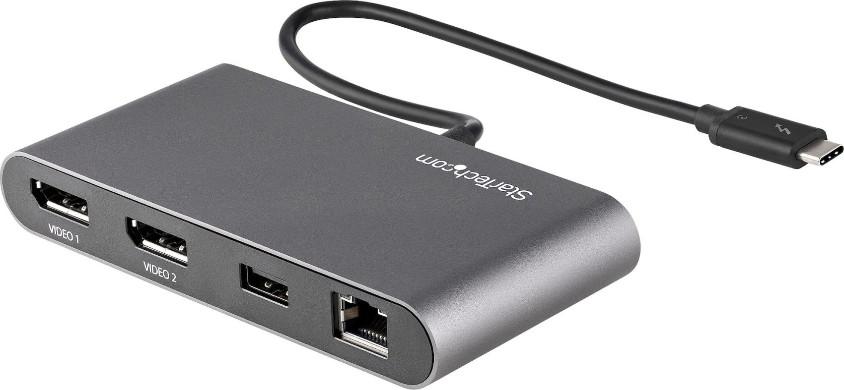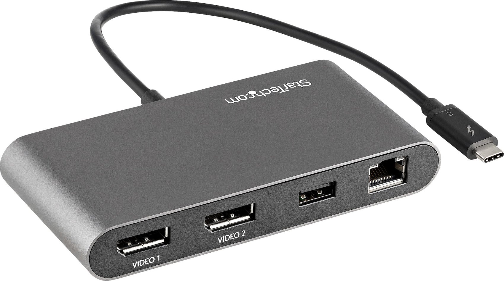 StarTech.com Mini Dock Thunderbolt 3 - Docking Station Portátil para 2 Monitores con DP 4K 60Hz, 1x Hub USB-A (USB 3.0/5 Gbps), GbE - Cable de 28cm - Adaptador Multipuertos TB3 - Mac/Windows. Tecnología de conectividad: Alámbrico, Interfaz de host: Thunderbolt 3. Ethernet LAN, velocidad de transferencia de datos: 10,100,1000 Mbit/s, Estándares de red: IEEE 802.3ab, IEEE 802.3i, IEEE 802.3u. Color del producto: Gris, Velocidad de transferencia de datos: 5 Gbit/s, Resolución (máxima digital): 3840 x 2160 Pixeles. Sistema operativo Windows soportado: Windows 10, Windows 10 Education, Windows 10 Education x64, Windows 10 Enterprise, Windows 10..., Sistema operativo MAC soportado: Mac OS X 10.10 Yosemite, Mac OS X 10.11 El Capitan, Mac OS X 10.12 Sierra, Mac OS X 10.13 High..., Sistema operativo de servidor soportado: Windows Server 2008 R2, Windows Server 2012, Windows Server 2012 x64. Certificados de sostenibilidad: CE, RoHS
