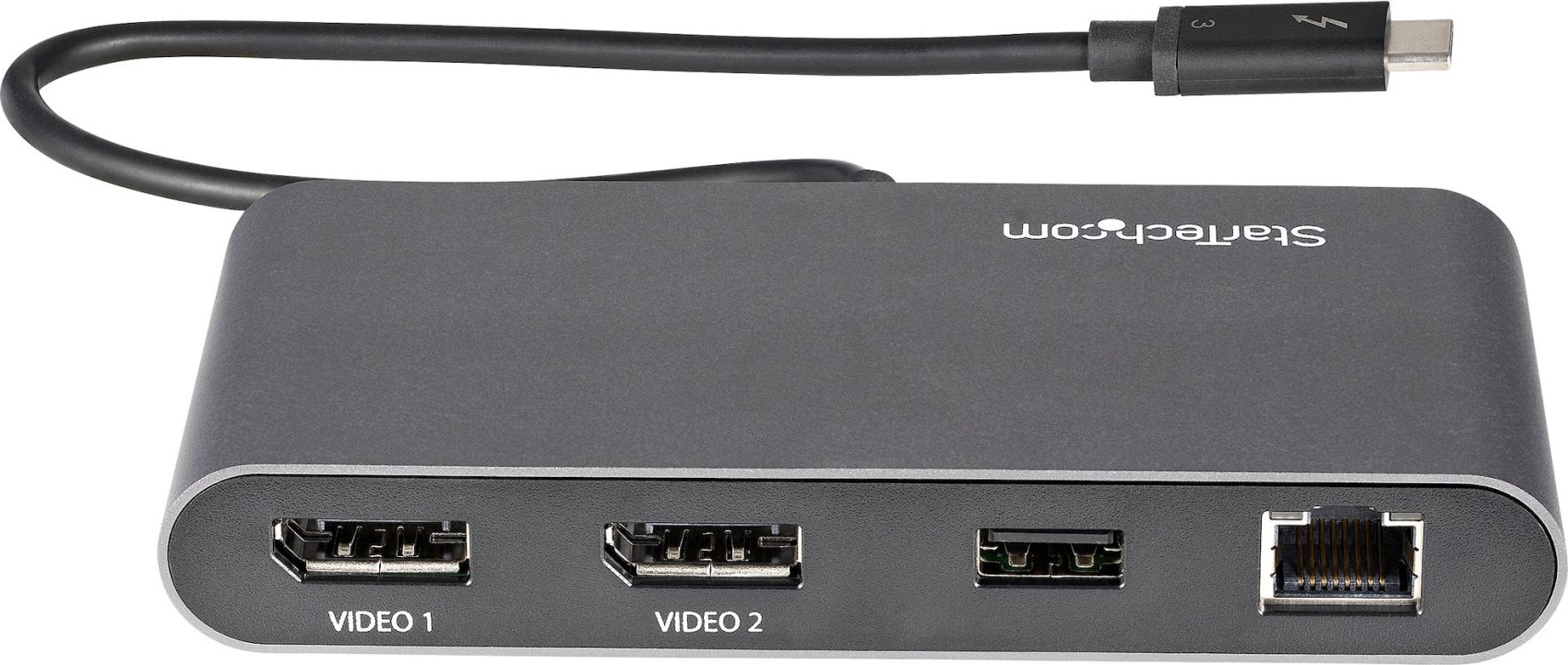 Docking Station para Portátil Mac & Windows® Alimentado por el Bus 1x USB-AEste replicador de puertos con certificación Thunderbolt™ 3 es un minireplicador compacto que ofrece las conexiones esenciales para la productividad. Con alimentación por bus, el replicador le permite conectar con dos pantallas DisplayPort 4K, Ethernet Gigabit y un puerto USB-A (USB 3.2); para más flexibilidad de la configuración, el cable Thunderbolt 3 incluido tiene una longitud extendida de 28cm.Cree una estación de trabajo 4K 60Hz dualIdeal para la edición de vídeos 4K u otras tareas relacionadas con Ultra HD, este replicador portátil de puertos Thunderbolt™ 3 a DisplayPort es compatible con 40Gbps de rendimiento y resolución 4K a 60Hz, en dos monitores DisplayPort, a través de un solo puerto Thunderbolt™ 3. Ejecute, en dos pantallas independientes, aplicaciones que requieren un uso intensivo de recursos, sin que se agote toda la capacidad del sistema.Conecte su ordenador portátil a:- 2x pantallas 4K DisplayPort (DP) (resolución de hasta 4096 x 2160 a 60Hz)Tamaño compacto y cable anfitrión de 28cm incorporadoCon un tamaño de apenas 6,1cm x 12,4cm, este replicador ocupa un espacio mínimo en su escritorio y en la bolsa de su ordenador portátil. El cable incorporado de 28cm ofrece mayor alcance y reduce la tirantez entre puerto y conector en equipos MacBook y ordenadores portátiles colocados en soportes elevadores o, en caso necesario, la flexibilidad de colocar el replicador alejado del portátil sobre el escritorio.Los puertos que más necesita- 1x puerto USB 3.2 Gen 1 Type-A (5Gbps)- 1x puerto Ethernet Gigabit, compatible con las funciones PXE Boot (reinicio PXE) y WOL ("Wake-on-LAN"; reinicio mediante red)Ideal para configuraciones de estación de trabajo de consumo de alimentación intensivoDebido a que muchos ordenadores portátiles de generación posterior, con alto consumo de alimentación, requieren más de 100W de potencia para mantenerse cargados, para mantener su portátil cargado algunos usuarios prefieren utilizar el adaptador de alimentación de su portátil, en lugar de su replicador de puertos.Este mini replicador de puertos TB3 con alimentación por bus es ideal para esos usuarios, ya que proporciona total rendimiento y funcionalidad Thunderbolt™ 3 al replicador, mientras que los ordenadores portátiles de su estación de trabajo se cargan por separado.El modelo TB3DKM2DPL tiene certificación Thunderbolt y está avalado por la garantía de 3 años de StarTech.com, con soporte técnico gratuito de por vida.The StarTech.com Advantage