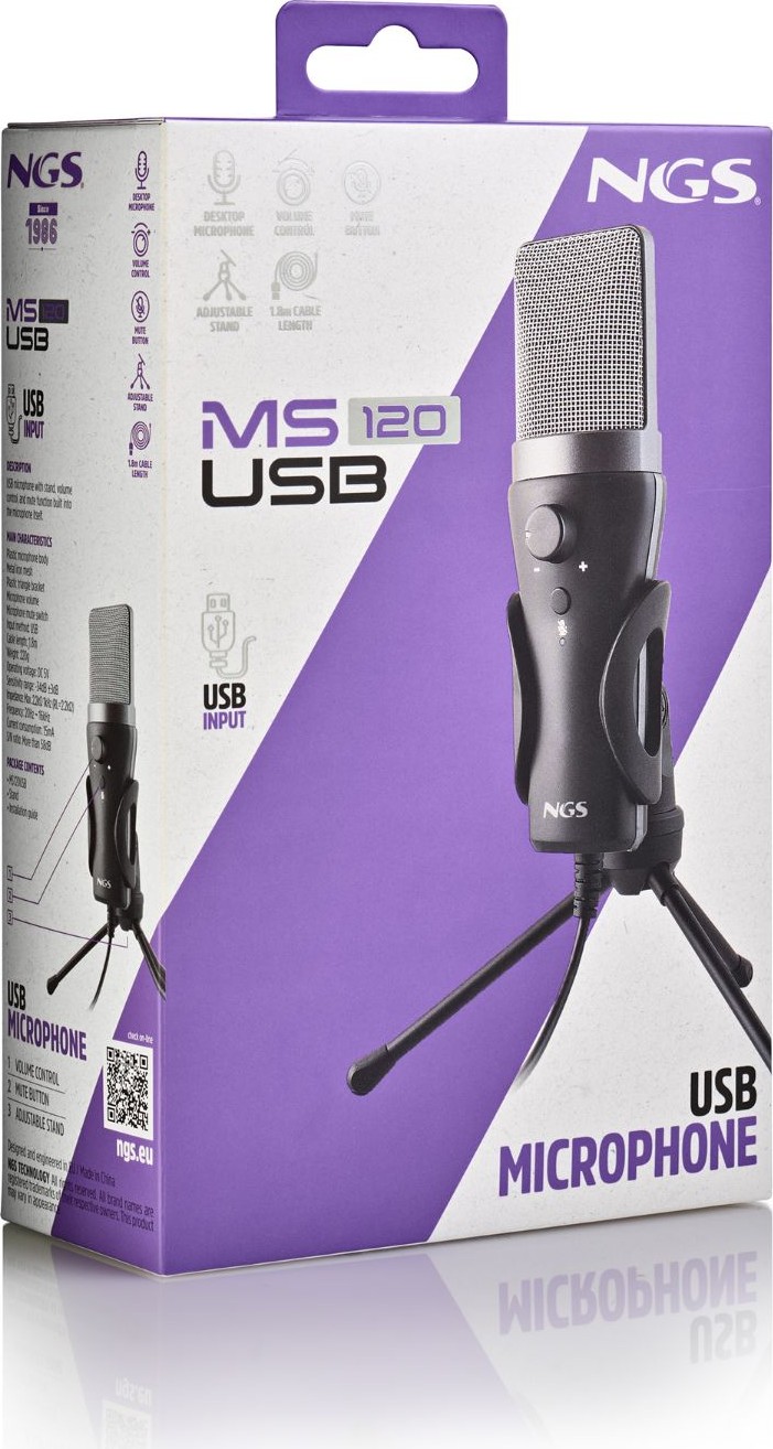 NGS MS120 USB. Tipo: Micrófono para crear podcasts, Sensibilidad de micrófono: -34 dB, Frecuencia de micrófono: 20 - 16000 Hz. Tecnología de conectividad: Alámbrico, Interfaz del dispositivo: USB. Color del producto: Negro, Material de la carcasa: Metal, Plástico, Longitud de cable: 1,8 m. Fuente de energía: CC, Voltaje de operación: 5 V, Consumo de energía: 15 mA. Ancho: 53 mm, Profundidad: 47 mm, Altura: 160 mm