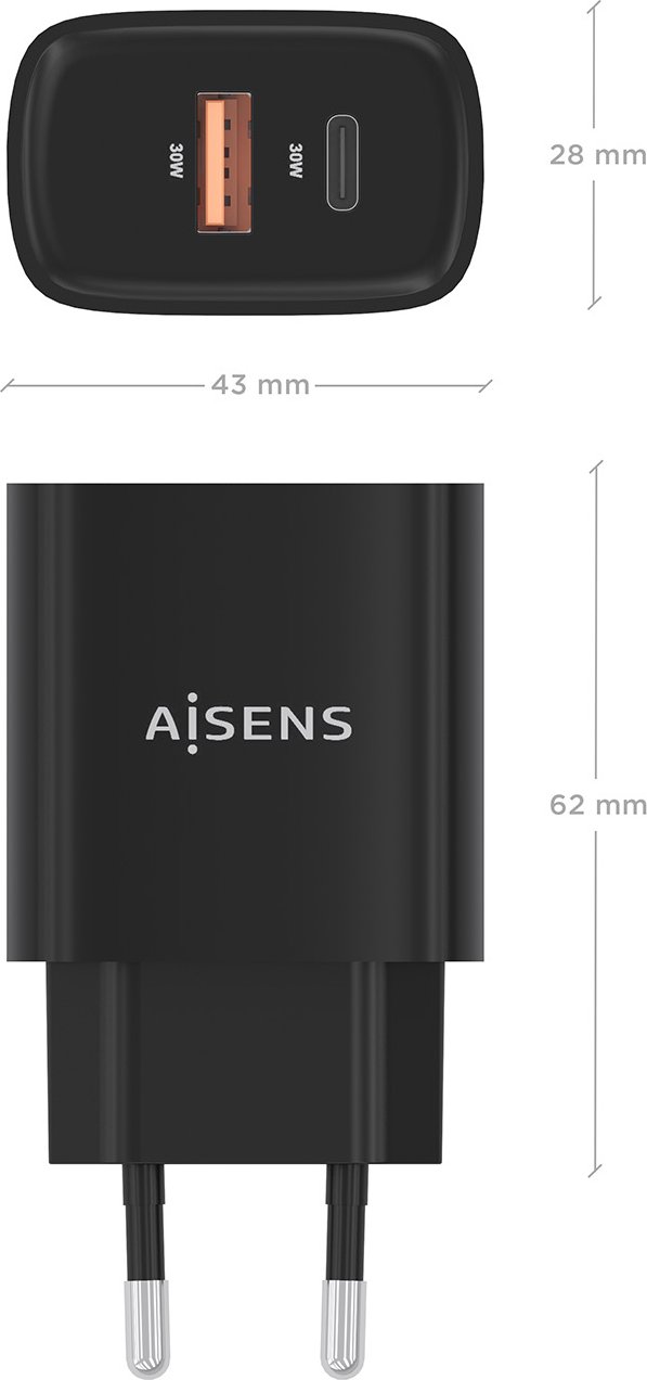 Aisens Cargador Gan 30w, 1xusb-c Pd3.0 Qc4.0, 1xusb-a Qc3.0, Negro
