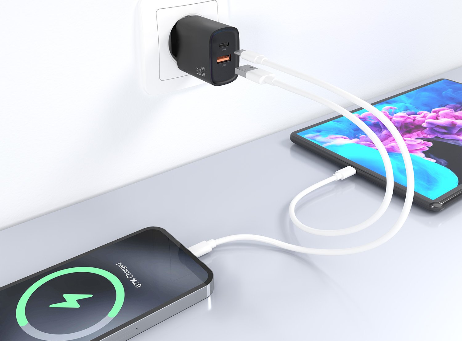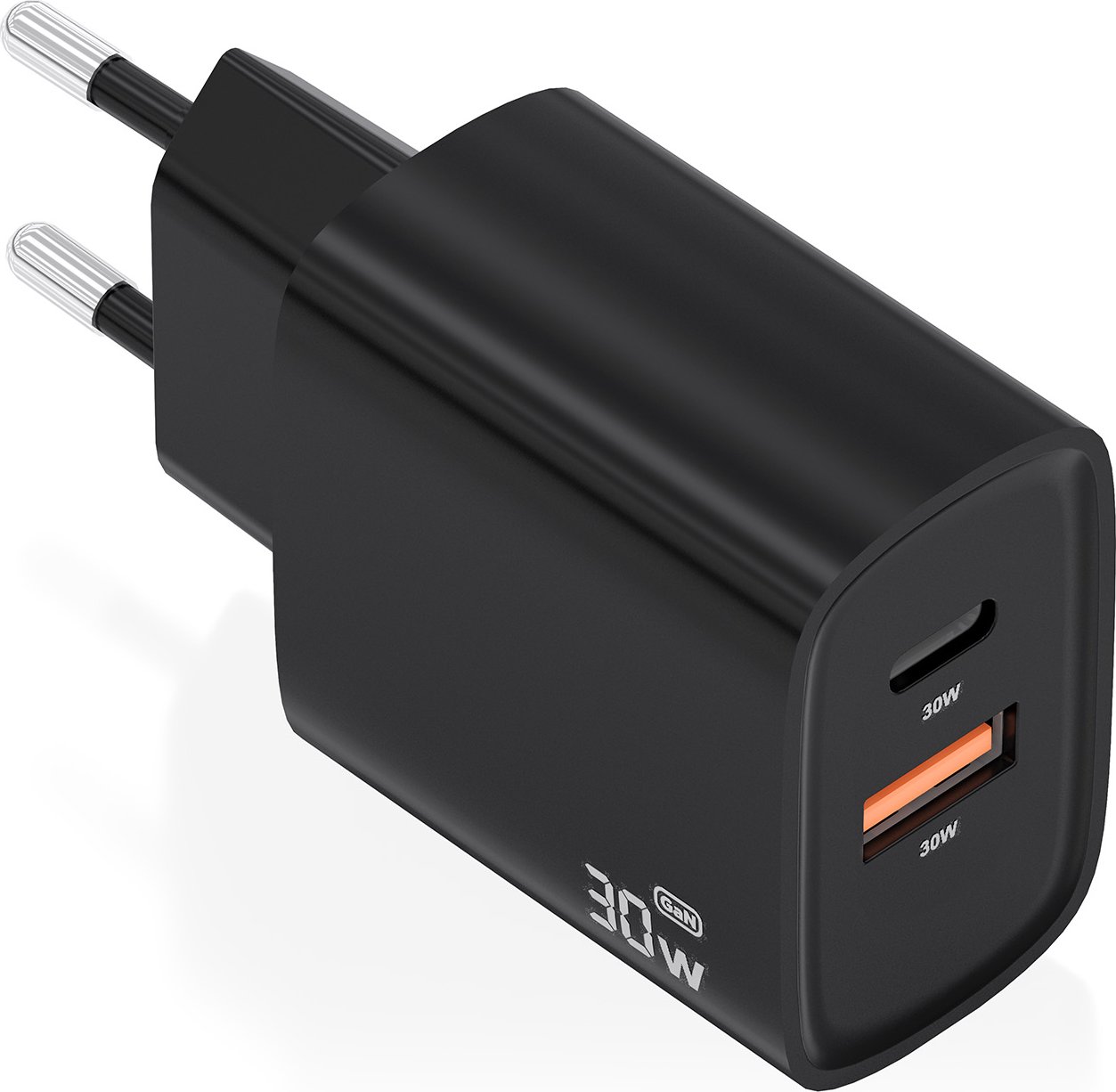 - Cargador GaN 30W, 1xUSB-C PD3.0 QC4.0, 1xUSB-A QC3.0, Negro