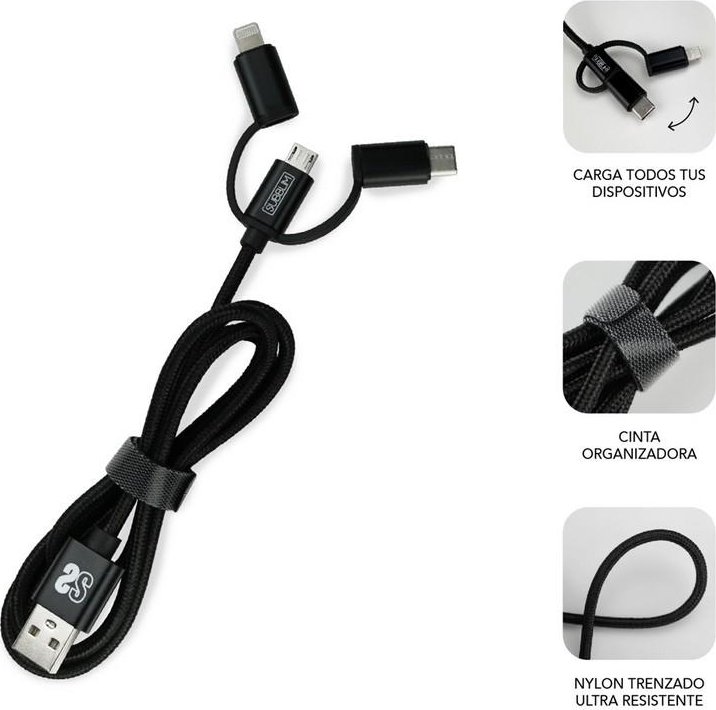 Gracias a los tres conectores más utilizados en el mercado podrás cargar con un solo cable cualquier dispositivo con conector Micro USB, Type C o Lightning mediante adaptadores intercambiables.