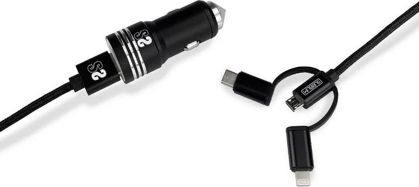 - Cargador Coche 2xUSB Dual Car Charger Alum 2.4A + Cable 3 in 1 Black