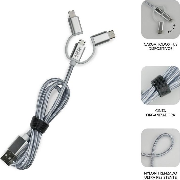 Diseñado para soportar un uso intenso el cable 3 en 1 Micro USB+Type C+Lightning a USB A es idóneo para tu estilo de vida activo y móvil. Incluye un organizador de cable para llevarlo siempre recogidos y protegido. Ha sido sometidos a ensayos de dobladura de 90° hasta un total de 10.000 veces.