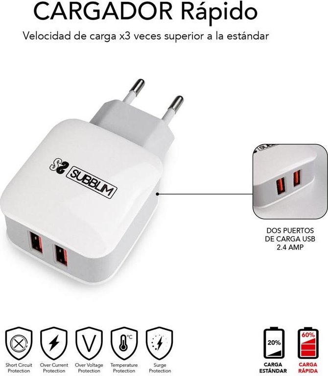 Con este cargador de dos puertos y el cable incluido que dispone de los tres conectores más comunes del mercado podrás mantener tus dispositivos siempre cargados de la forma más sencilla. El puerto USB-A universal funciona con smartphones, tabletas, baterías externas, cámaras digitales y muchos otros dispositivos. Con una amplia salida total de 2.4A podrás suministrar corriente a dos dispositivos simultáneamente de forma rápida.