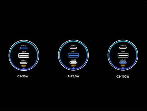 .Charges three devices simultaneously . It has one USB-A port and two USB-C ports.