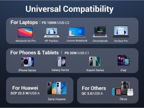 - Compatibilidad del cargador: Auriculares, Ordenador portátil, Teléfono móvil, Portátil, Batería portátil, Teléfono