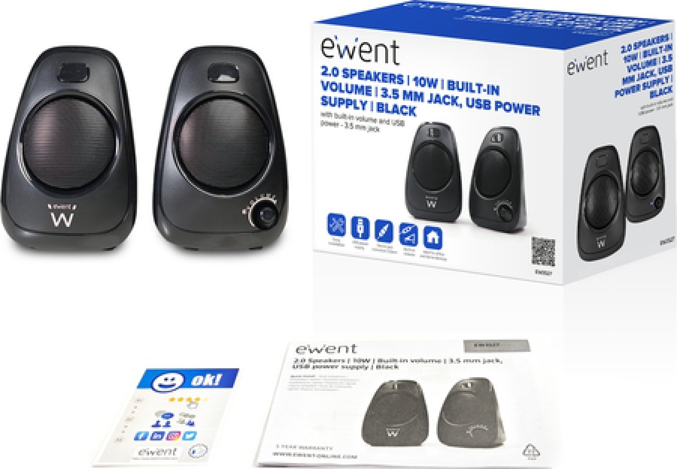 Ewent EW3527. Uso recomendado: PC. Canales de salida de audio: 2.0 canales, Número de dispositivos: 1. Tecnología de conectividad: Alámbrico. Potencia estimada RMS: 6 W, Rango de frecuencia: 80 - 20000 Hz. Color del producto: Negro
