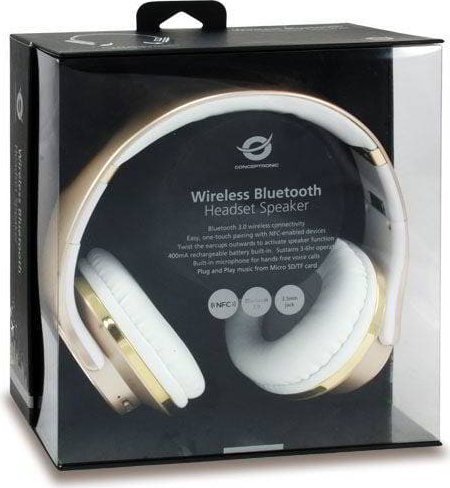 Conceptronic CHSPBTNFCSPKG. Tipo de producto: Auriculares. Tecnología de conectividad: Inalámbrico y alámbrico, Bluetooth. Uso recomendado: Llamadas/Música. Frecuencia de auricular: 90 - 18000 Hz. Peso: 254 g. Color del producto: Oro, Blanco