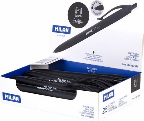 Bolígrafo P1 touch negro, con el cuerpo del mismo color que la tinta. Longitud de escritura aproximada de 1.200 metros. Punta 1 mm. Tinta fabricada en Alemania. Diseño original creado por el departamento de I+D de MILAN. Medidas bolígrafo: 14,1 x 1,7 cm. 1 cm Ø.
