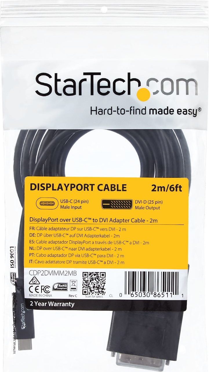 Cable Adaptador USB Type-C™ a DVI Compatible con Thunderbolt™ 3Este cable USB-C a DVI le permite conectar su dispositivo equipado con Thunderbolt 3 o USB Type-C a un monitor DVI para ordenador, mediante un solo cable, lo cual constituye una solución práctica y que evita el desorden. Impresionante calidad de imágenes El cable adaptador USB-C a DVI le permite aprovechar al máximo las capacidades de vídeo integradas en su conexión USB-C, a fin de ofrecer asombrosa calidad de imágenes a resoluciones de hasta 1920 x 1200. Además, el cable de vídeo USB-C es retrocompatible con las pantallas a 1080p, lo cual lo convierte en el accesorio ideal para aplicaciones domésticas, de oficina u otros espacios de trabajo. Instalación sin estorbo de cables Con una longitud de 2 metros, este cable para monitor de ordenador ofrece una conexión compacta que evita el exceso de cables y adaptadores, a fin de garantizar una instalación ordenada y profesional. Para instalaciones que requieren conexiones de menor o mayor longitud, también ofrecemos un cable USB-C a DVI de 1m (CDP2DVI3MBNL), lo cual le permite elegir la longitud de cable más adecuada para su instalación. Sencilla conectividad El conector reversible USB-C permite una conexión fácil y práctica. Para garantizar un fácil uso e instalación, este cable USB-C a DVI funciona en ordenadores con sistema operativo tanto Windows, como Mac y se instala mediante el sencillo sistema plug-and-play. El modelo CDP2DVIMM2MB está avalado por la garantía de 3 años de StarTech.com y con soporte técnico gratuito de por vida. Nota:Para que este adaptador funcione, su puerto USB-C debe ser compatible con DisplayPort a través de USB-C (modo Alt (alternativo) de DisplayPort).The StarTech.com Advantage