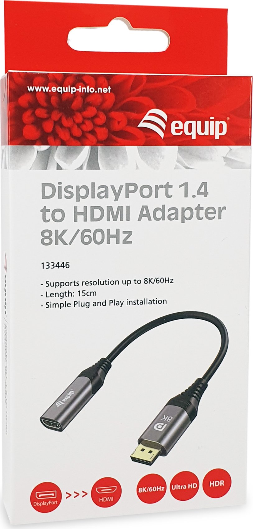 Equip 133446. Longitud de cable: 0,15 m, Conector 1: DisplayPort, Conector 2: HDMI. Certificados de sostenibilidad: RoHS, CE. Peso: 30 g, Ancho: 20 mm, Profundidad: 10 mm. Cantidad por paquete: 1 pieza(s), Ancho del paquete: 23 mm, Profundidad del paquete: 75 mm