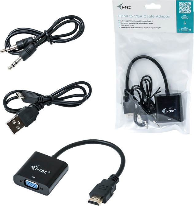 i-tec HDMI2VGAADA. Longitud de cable: 0,15 m, Conector 1: HDMI, Conector 2: VGA. Peso: 94 g, Ancho: 191 mm, Profundidad: 110 mm. Ancho del paquete: 168 mm, Profundidad del paquete: 110 mm, Altura del paquete: 54 mm