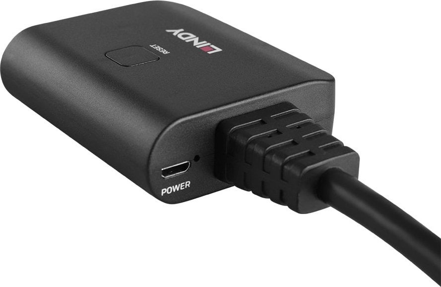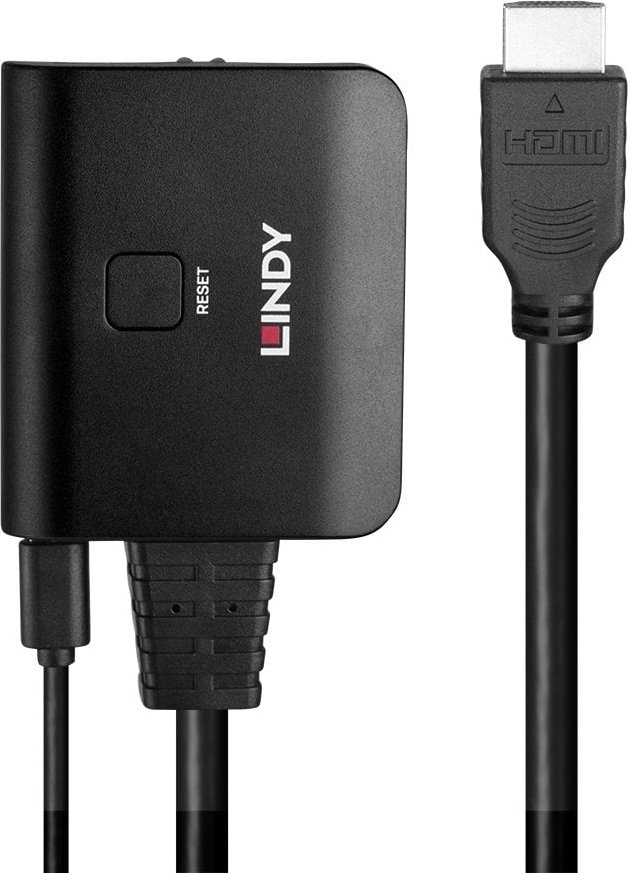 Lindy 38356. Tipo de puerto de vídeo: HDMI, Salida de vídeo: 2x HDMI. Máxima resolución: 3840 x 2160 Pixeles, Color del producto: Negro, Material de la carcasa: Acrilonitrilo butadieno estireno (ABS). Ancho: 65 mm, Profundidad: 54,5 mm, Altura: 20,5 mm. Cantidad por paquete: 1 pieza(s), Ancho del paquete: 190 mm, Profundidad del paquete: 145 mm. Cables incluidos: HDMI, USB de tipo A a Micro-USB de tipo B