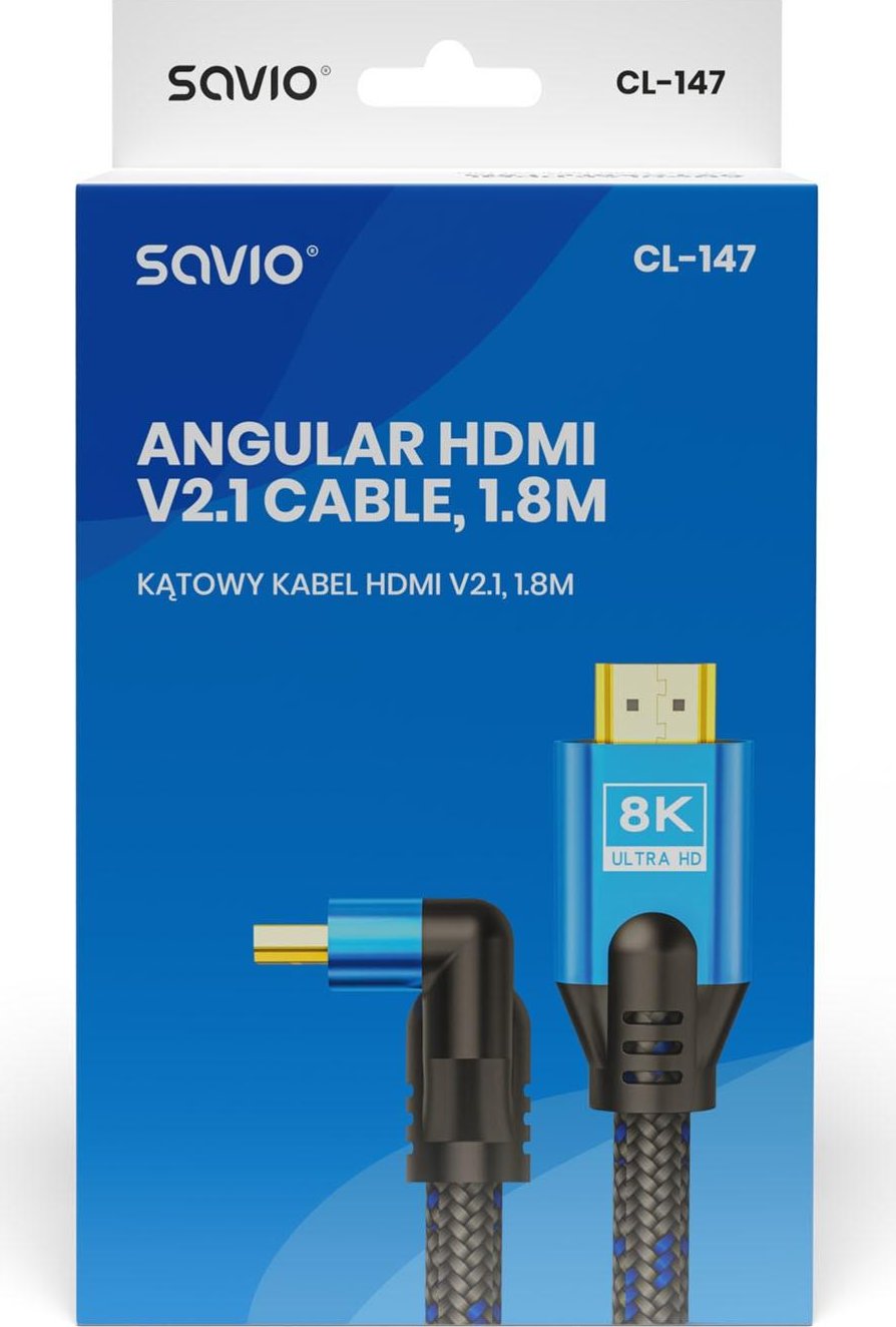 Savio Cl-147 Kabel Hdmi V2.1, Ktowy,1.8m, Mied, Oplot Baweniany, Metalowe Wtyczki Cable Hdmi 1,8 M Hdmi Tipo A (Estándar) Negro, Azul