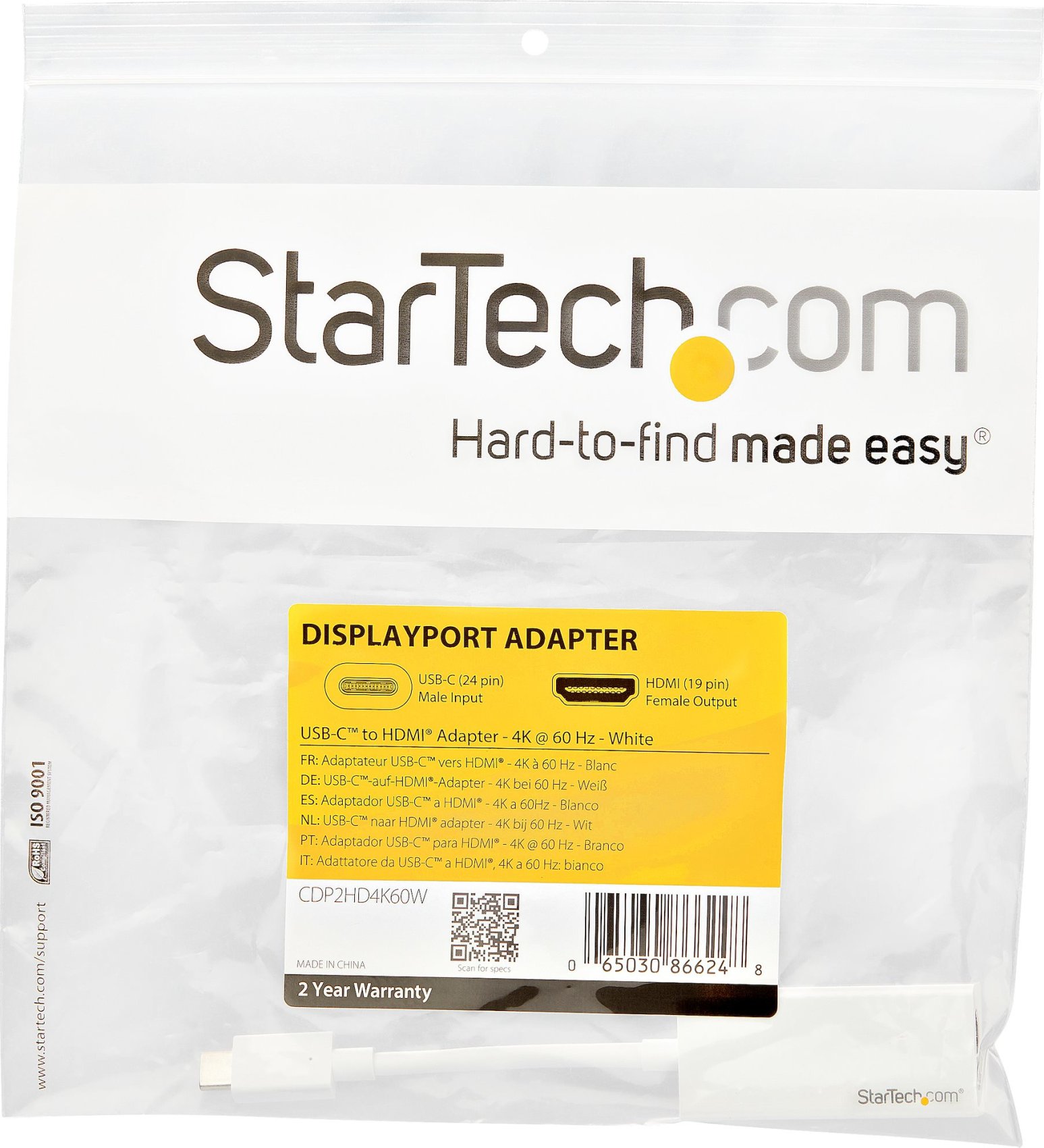 StarTech.com Adaptador USB-C a HDMI - 4K 60Hz - Blanco. Conector USB: USB Tipo C, Género del conector USB: Macho, Factor de forma del conector USB: Derecho. Color del producto: Blanco, Longitud del cable USB: 0,093 m. Ancho: 25 mm, Profundidad: 150 mm, Altura: 11 mm. Cantidad por caja: 120 pieza(s), Ancho de la caja principal: 335 mm, Longitud de la caja: 499 mm