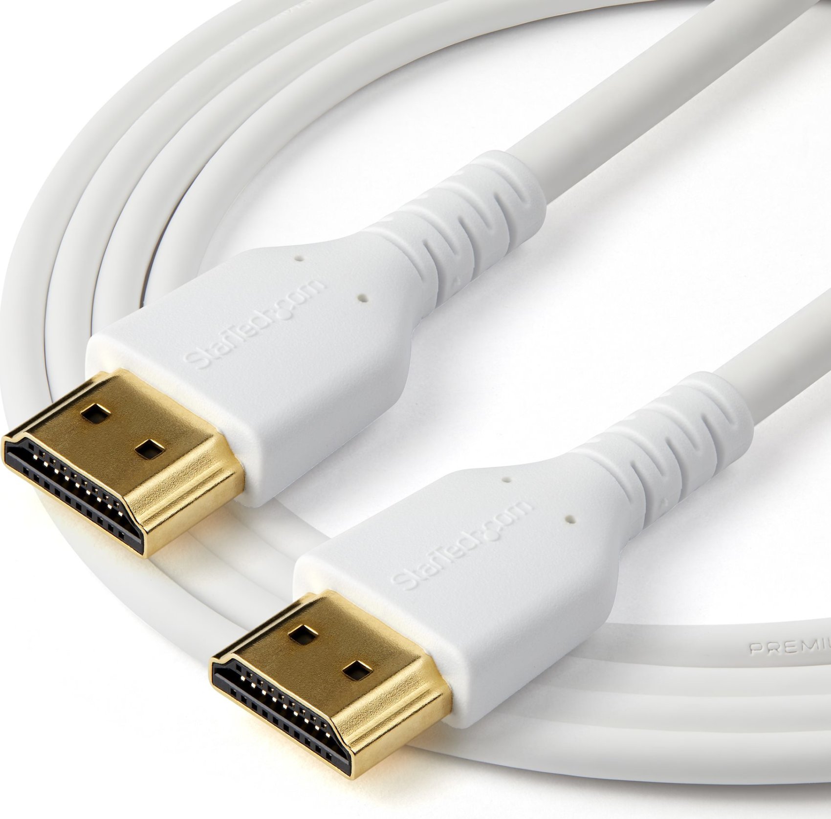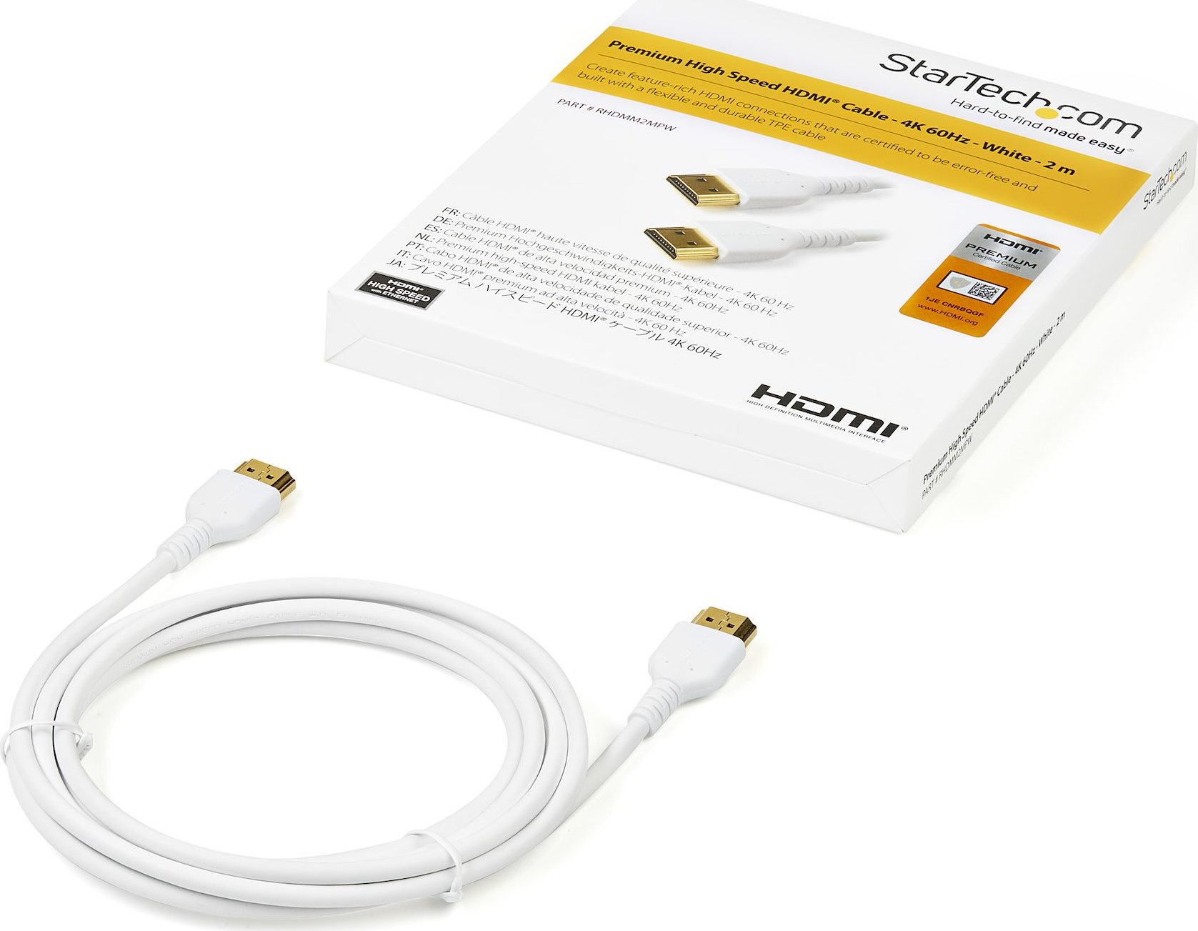 StarTech.com Cable de 2m HDMI 2.0 Certificado Premium de alta velocidad con Ethernet - Durable - UHD 4K 60Hz - con Fibra de Aramida - HDMI 2.0 - TPE - para Monitores y TV - Blanco. Longitud de cable: 2 m, Conector 1: HDMI tipo A (Estándar), Género del conector 1: Macho, Conector 2: HDMI tipo A (Estándar), Género del conector 2: Macho, Contactos del conector chapado: Oro, Versión HDMI: 2.0, Canal de retorno de audio (ARC), Color del producto: Blanco