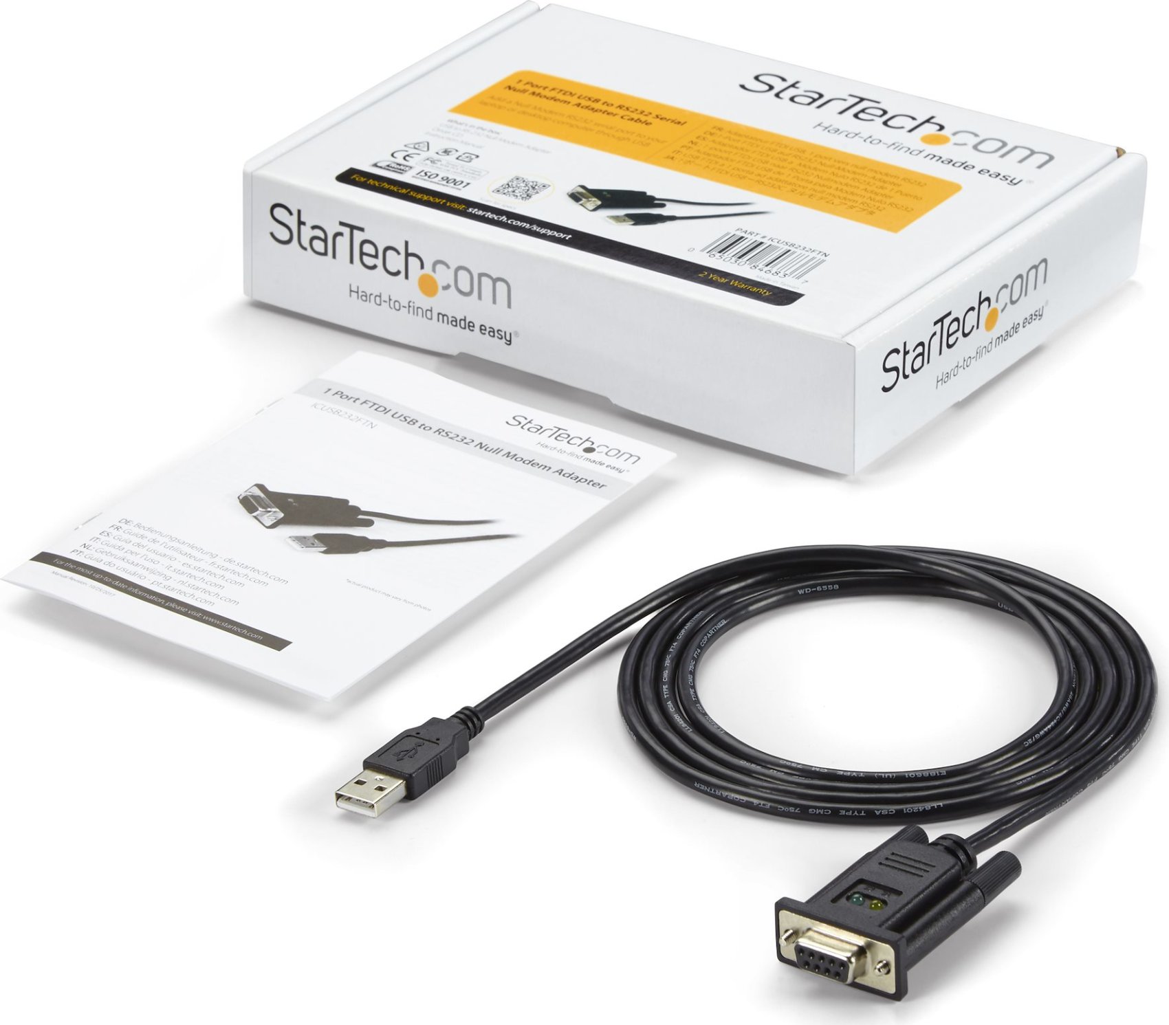 StarTech.com Cable Adaptador de 1 Puerto USB a Módem Nulo Null DB9 RS232 Serie DCE con FTDI. Color del producto: Negro, Longitud de cable: 1,7 m, Conector 1: USB tipo A. Cantidad por paquete: 1 pieza(s), Ancho del paquete: 208 mm, Profundidad del paquete: 146 mm. Peso: 88 g. Certificados de sostenibilidad: CE, RoHS. Ancho de la caja principal: 450 mm, Longitud de la caja: 525 mm, Alto de la caja principal: 335 mm