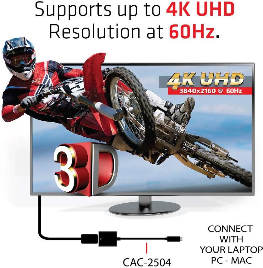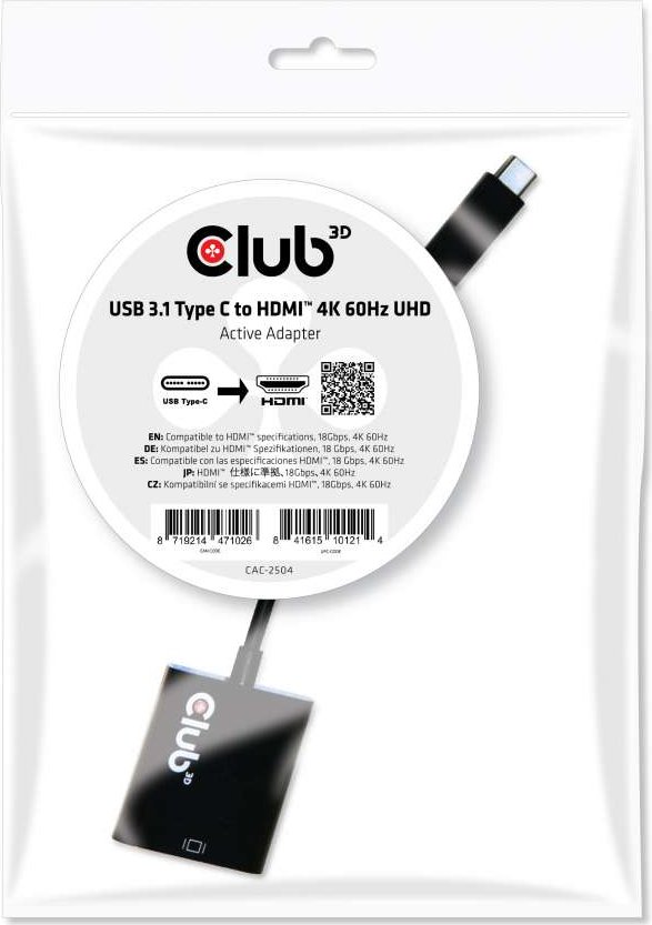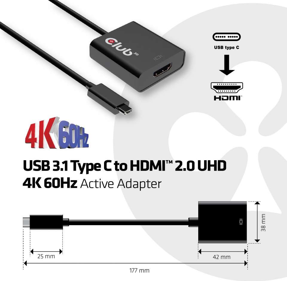 el Club 3D CAC-2504 es un convertidor de señal Active HDMI™. El USB 3.1 Type C a HDMI™ 2.0 UHD 4K 60HZ Adaptador Activo es la solución más sencilla para conectar su dispositivo fuente USB 3.1 tipo C con modo alterno DisplayPort ™ a un monitor, televisión o proyector UHD habilitado para HDMI™ 2.0. El adaptador es compacto y altamente portátil. Alimentado por el puerto USB-C, el adaptador no requiere alimentación externa y es ideal para usar con notebooks y Ultrabooks.