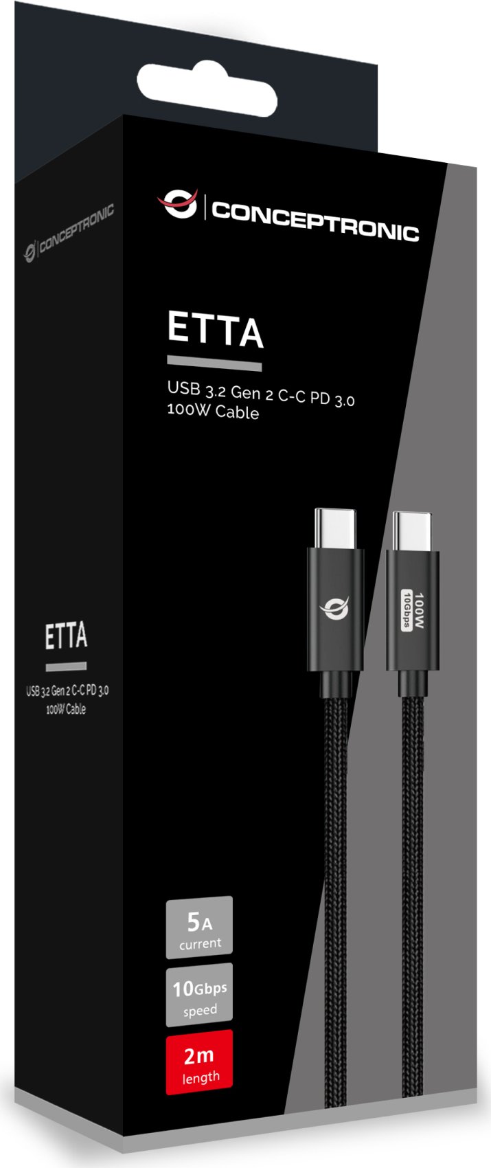 Conceptronic ETTA02B20. Longitud de cable: 2 m. Conector 1: USB C, Conector 2: USB C, Versión USB: USB 3.2 Gen 2 (3.1 Gen 2), Tasa de transferencia (máx): 20 Gbit/s, Color del producto: Negro