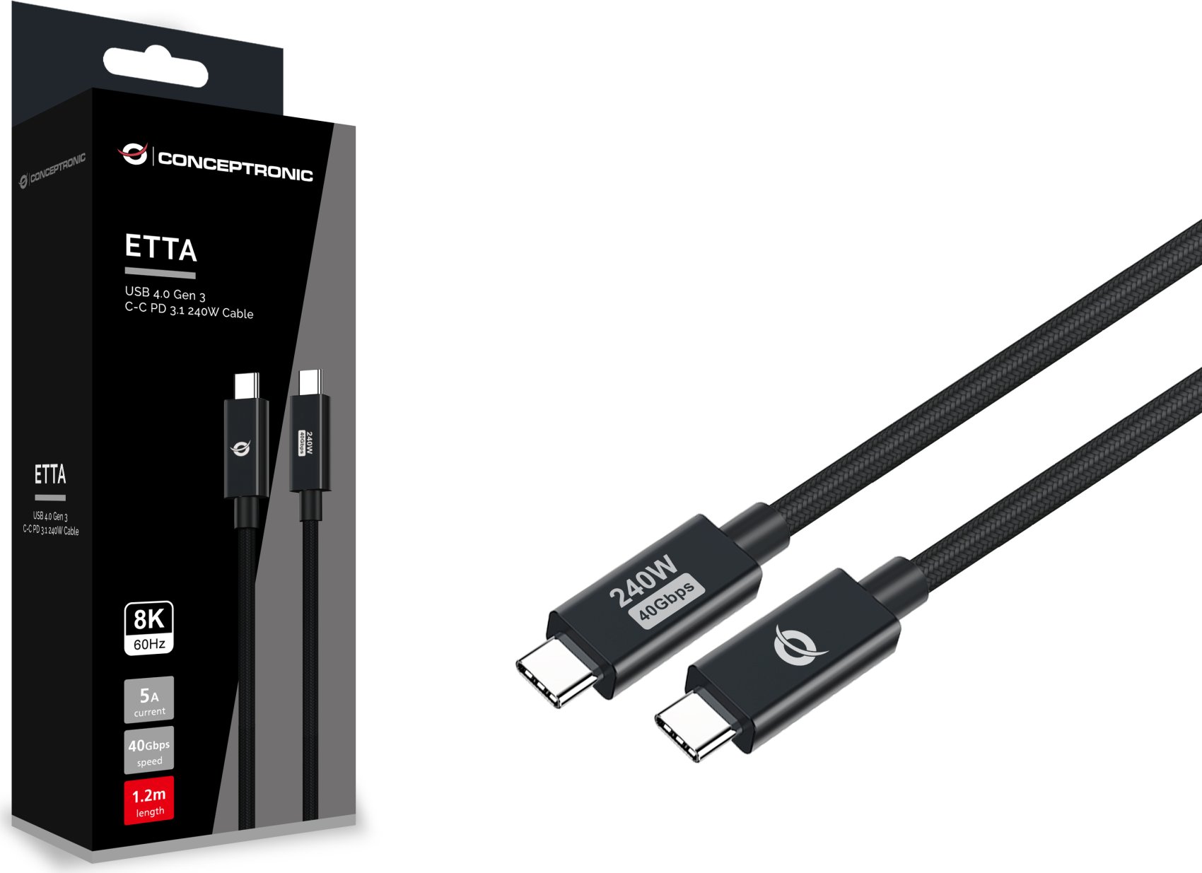 Conceptronic ETTA04B12. Longitud de cable: 1,2 m. Conector 1: USB C, Conector 2: USB C, Versión USB: USB4 Gen 3x2, Tasa de transferencia (máx): 40 Gbit/s, Color del producto: Negro