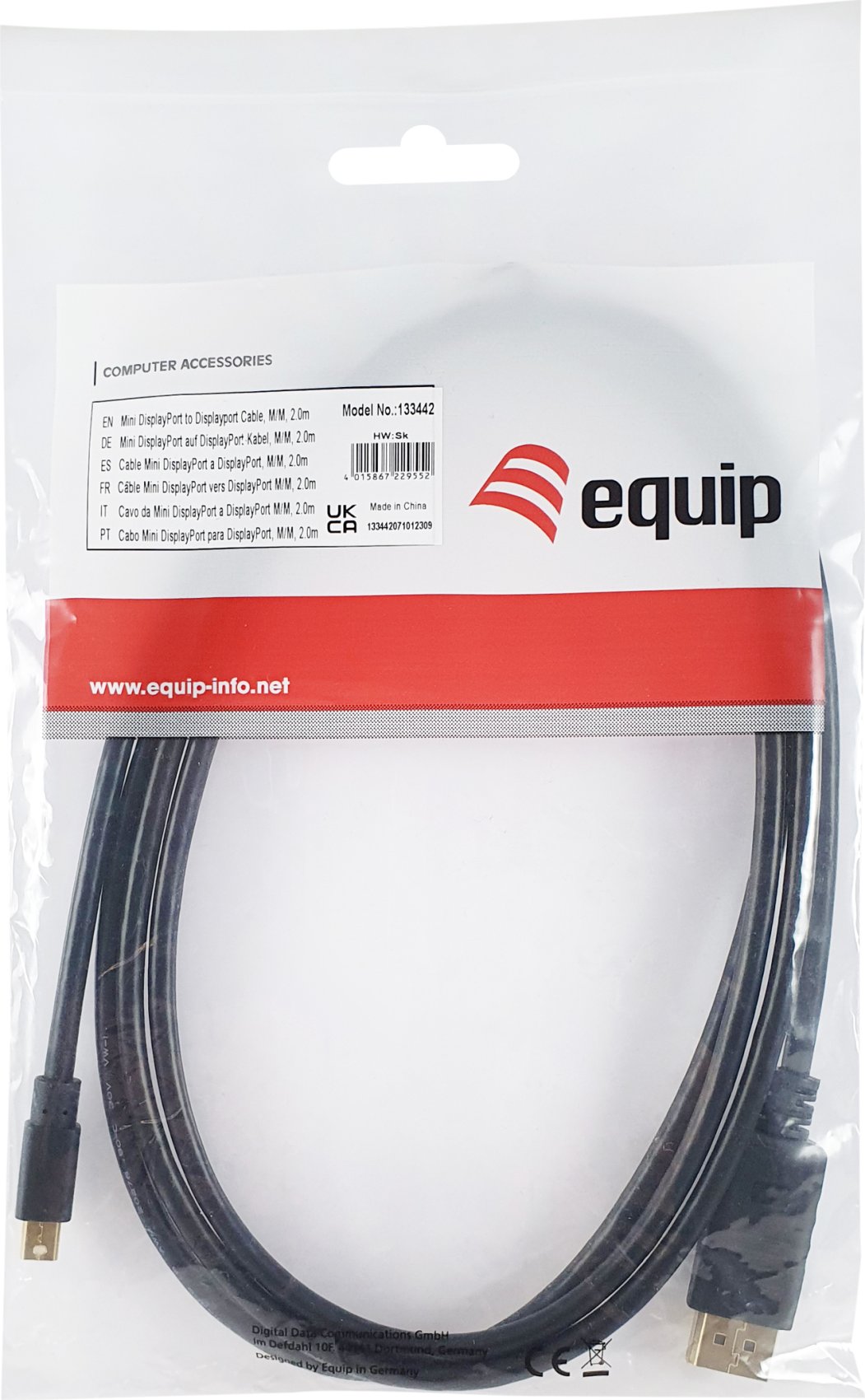 Equip Cable de Mini DisplayPort a DisplayPort, M/M, 2,0 m, 4K/60Hz. Longitud de cable: 2 m, Conector 1: DisplayPort, Conector 2: Mini DisplayPort. Certificados de conformidad: CE, RoHS, UKCA. Ancho del paquete: 175 mm, Profundidad del paquete: 20 mm, Altura del paquete: 275 mm. Cantidad por paquete: 1 pieza(s). País de origen: China, Ancho de la caja principal: 300 mm, Longitud de la caja: 280 mm