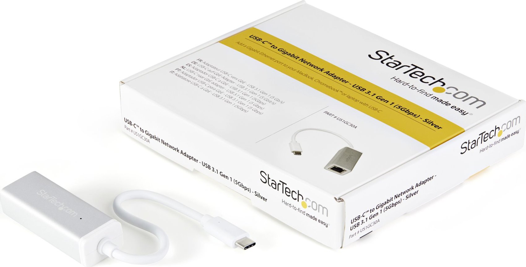 Utilice este elegante conversor de aluminio para agregar un puerto Ethernet Gb a su MacBook, Chromebook u ordenador portátil equipado con USB Type-CAhora es fácil conectar con una red Gigabit, a través del puerto USB-C™ de su ordenador portátil. Este adaptador de red Ethernet Gigabit (GbE) ofrece una conexión de red fiable, sin tener que instalar controladores. Su elegante acabado plateado armoniza a la perfección con un MacBook y cualquier ordenador portátil o Chromebook™ con acabado similar. Elegante diseño con fácil portabilidad Con diseño de aluminio de alta calidad y acabado plateado, el adaptador de red es el accesorio perfecto para su MacBook y cualquier ordenador portátil o Chromebook™ con acabado similar. Compacto y portátil, este adaptador de red USB es el accesorio ideal para ordenadores portátiles. No es necesario llevar consigo un adaptador de alimentación para utilizarlo, ya que la alimentación se obtiene directamente del puerto anfitrión USB. Compatibilidad nativa con controladores, lo cual facilita la instalación Esté siempre preparado rápidamente. Solo tiene que conectar el adaptador al puerto USB-C de su ordenador portátil, para conectarlo a su red. El chipset del adaptador ofrece compatibilidad nativa con controladores en los sistemas Chrome OS™, Mac OS 10.10, Windows® 8.1. Potentes conexiones de red Gigabit El adaptador de red USB Type-C™ es compatible con el total ancho de banda Gigabit, gracias a que se aprovecha al máximo el rendimiento de la tecnología USB 3.0, también conocida como USB 3.1 Gen 1 (5Gbps). Es posible acceder a ficheros muy grandes a través de la red, a velocidades Gigabit. Fáciles conexiones a través de USB Type-C El conector USB Type-C es más pequeño y de uso más fácil que los conectores USB de generación anterior. Es un conector reversible, lo cual significa que es posible conectar sus dispositivos con cualquiera de las caras del conector hacia arriba. Siempre enchufará el cable de forma correcta: sin molestias ni riesgo de dañar el puerto. El modelo US1GC30A está avalado por la garantía de 2 años de StarTech.com y con soporte técnico gratuito de por vida.The StarTech.com Advantage