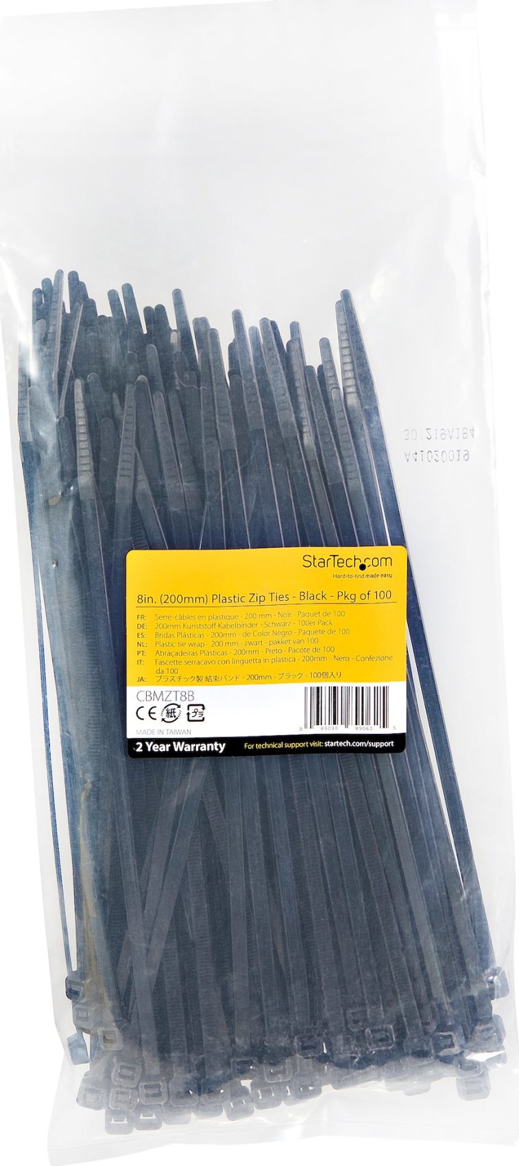 StarTech.com Bridas de 20cm para cables - 4 mm de ancho, 55 mm de diámetro, soportan 22 kg de tensión, de nylon, cierre automático y punta curva, 94V-2/UL, paquete de 100 - negras. Tipo: Brida reutilizable, Material: Nylon, Plástico, Color del producto: Negro. Longitud: 200 mm, Ancho: 8 mm, Altura: 4 mm. Cantidad por paquete: 100 pieza(s). Ancho de la caja principal: 371 mm, Longitud de la caja: 446 mm, Alto de la caja principal: 410 mm