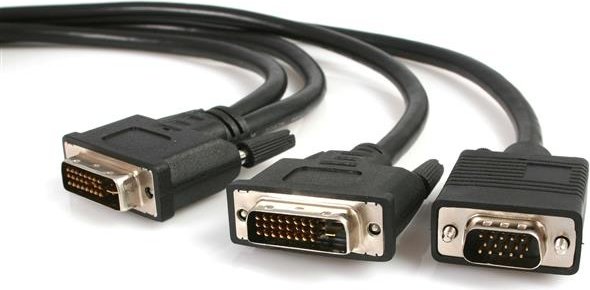 El cable multiplicador de vídeo DVI-I (macho) a DVI-D (macho) y HD15 VGA (macho) DVIVGAYMM6 de 1,8 m le permite conectar un monitor DVI-D y un monitor VGA a un único puerto de tarjeta gráfica DVI-I.