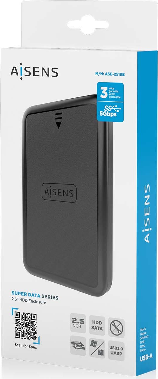 AISENS Caja externa 2.5" ASE-2519B 9.5mm SATA a USB 3.0/USB3.1 Gen1, Negro. Tipo de producto: Carcasa de disco duro/SSD. Número de unidades de almacenamiento compatibles: 1, Tamaño de la unidad de almacenamiento: 2.5", Interfaces de disco de almacenamiento soportados: SATA, Serial ATA II, Serial ATA III, Capacidad máxima de almacenaje: 2 TB. Velocidad de transferencia de datos: 5 Gbit/s. Color del producto: Negro. Conector USB: Micro-USB B
