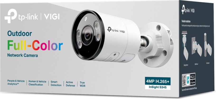 TP-Link INSIGHT S345. Tipo: Cámara de seguridad IP, Colocación soportada: Exterior, Tecnología de conectividad: Alámbrico. Tipo de montaje: Pared, Color del producto: Blanco, Factor de forma: Bala (forma). Ángulo de visión de la lente, horizontal: 100°, Ángulo de visión de la lente, vertical: 54°, Ángulo de visión de la lente, diagonal: 118°. Tipo de sensor: CMOS, Tamaño del sensor óptico: 25,4 / 2,7 mm (1 / 2.7"). Distancia de detección: 64 m, Distancia de observación: 27 m, Distancia de reconocimiento: 13 m