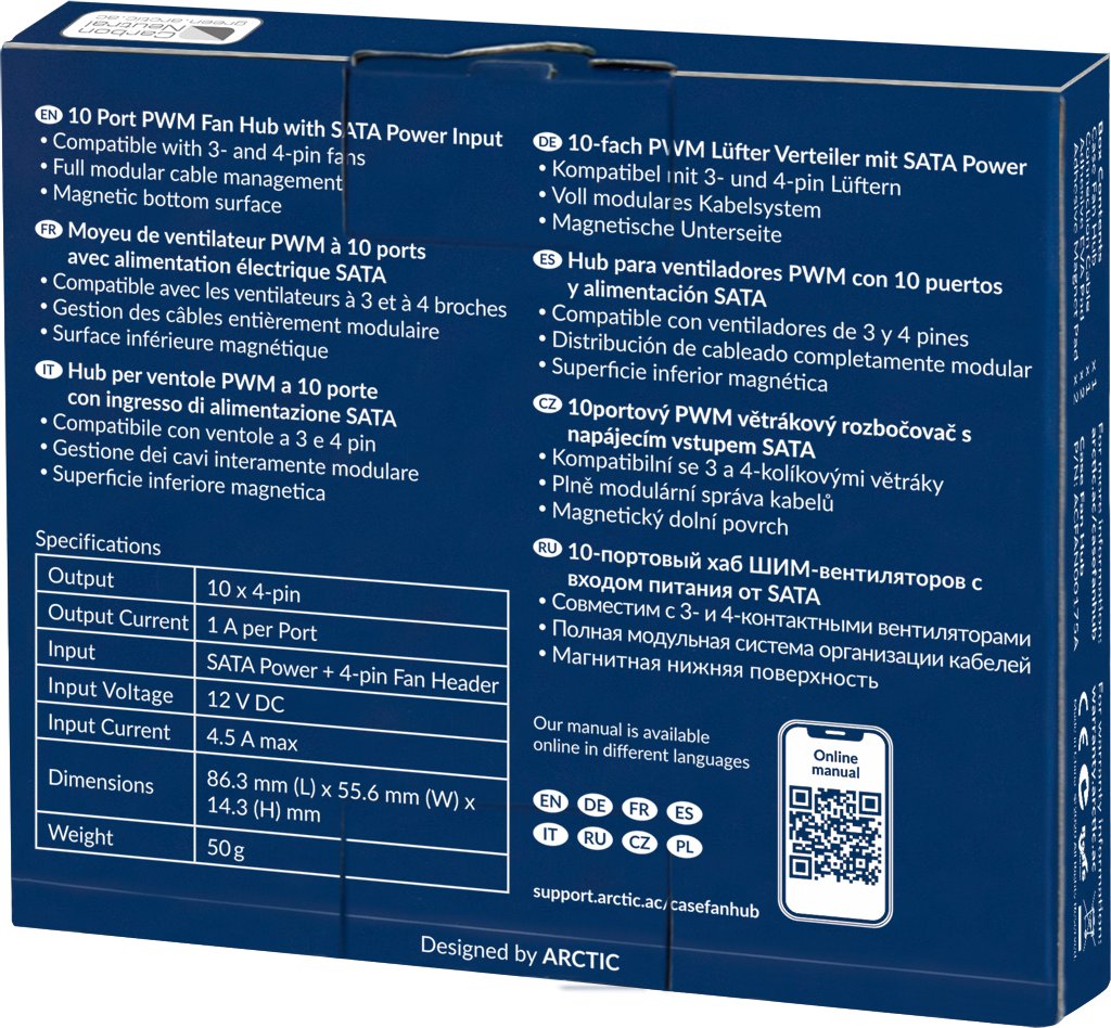 ARCTIC Case Fan Hub. Color del producto: Negro, Conector eléctrico: SATA. Ancho: 55,6 mm, Profundidad: 14,3 mm, Altura: 86,3 mm. Ancho del paquete: 55,6 mm, Profundidad del paquete: 14,3 mm, Altura del paquete: 86,3 mm. País de origen: Hong Kong. Agente de refrigeración: AireMarca: