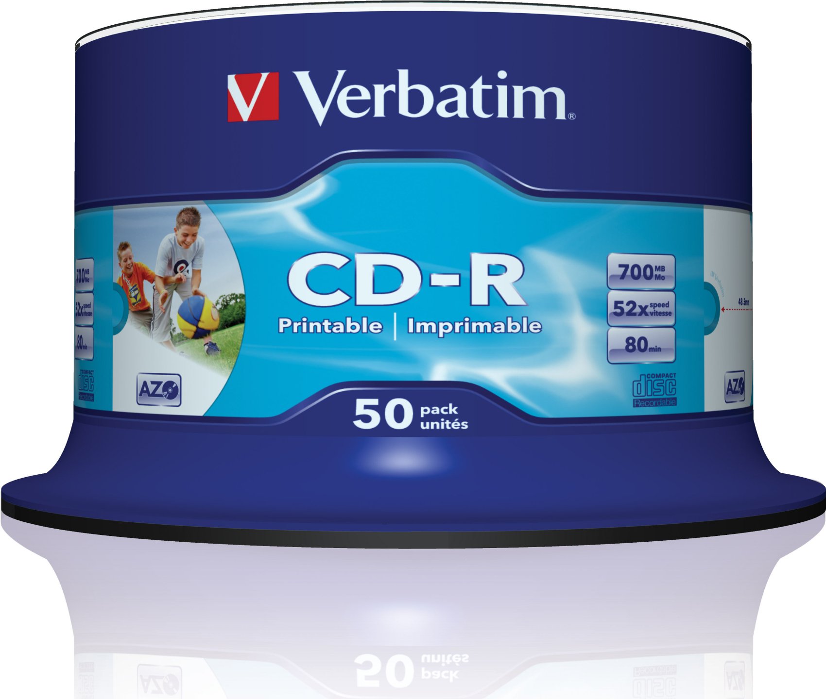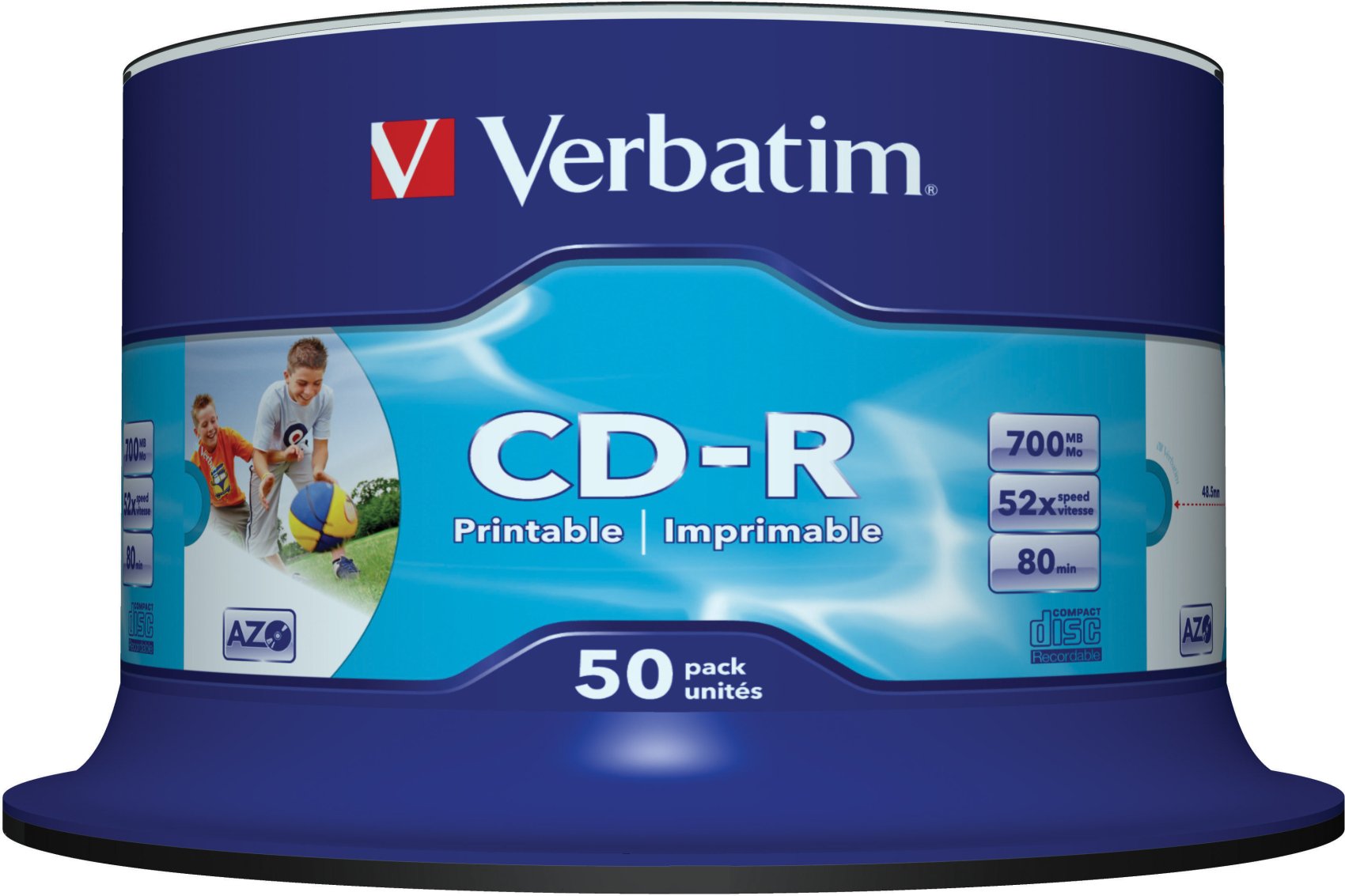 Verbatim CD-R AZO Wide Inkjet Printable - ID Branded. Tipo: CD-R, Capacidad de almacenamiento del CD: 700 MB, Cantidad por paquete: 50 pieza(s). Velocidad de escritura en CD: 52x