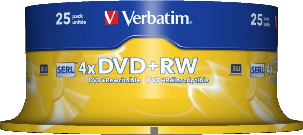 Verbatim DVD+RW Matt Silver. Capacidad de origen: 4,7 GB, Tipo: DVD+RW, Cantidad por paquete: 25 pieza(s). Tipo de embalaje: Eje. DVD, velocidad de escritura: 4x
