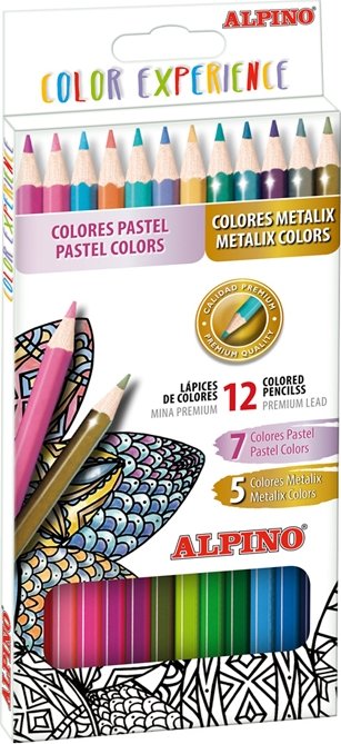 Estuche de 12 lápices ALPINO Color Experience colores especiales. Incluye 6 lápices en tonos pastel y 6 lápices en tonos metálicos con pintado de gran calidad. Su mina premium proporciona un pintado suave con posibilidad de degradar o enfatizar el color según la presión de aplicación. Los 12 colores especiales le darán un toque diferente a tus creaciones. Son ideales para cualquier manualidad o hobby como pintar mandalas, lettering, colorear, hacer bocetos, etc.
