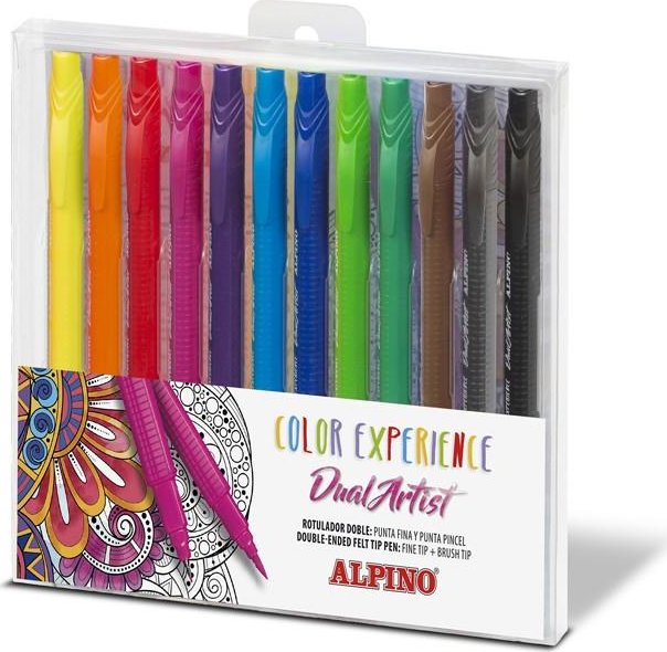 Caja de 12 rotuladores Alpino Color Experience de doble punta. Forma triangular, ergonómico y de cómodo agarre. Doble punta en el mismo marcador, permite dibujos más completos con un mismo rotulador:punta fine liner de 0,7 mm, perfecta para dibujar y perfilar. Punta pincel de 2,9 mm, ideal para lettering y colorear dibujos.