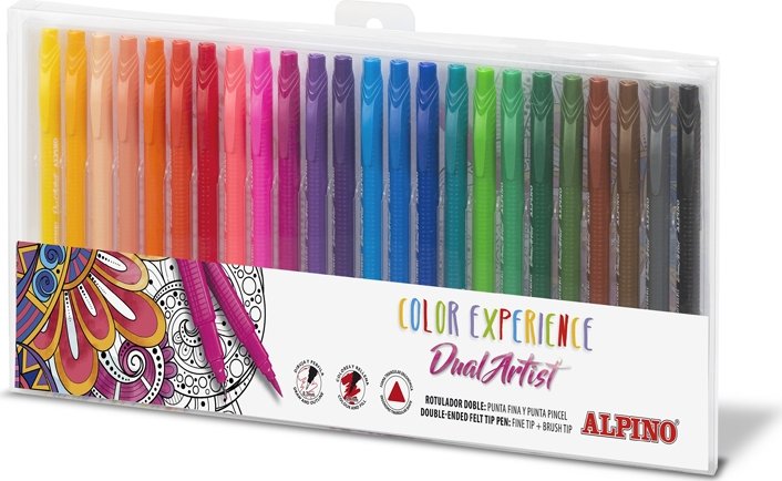 Caja de 24 rotuladores Alpino Color Experience de doble punta. Forma triangular, ergonómico y de cómodo agarre. Doble punta en el mismo marcador, permite dibujos más completos con un mismo rotulador:punta fine liner de 0,7 mm, perfecta para dibujar y perfilar. Punta pincel de 2,9 mm, ideal para lettering y colorear dibujos.