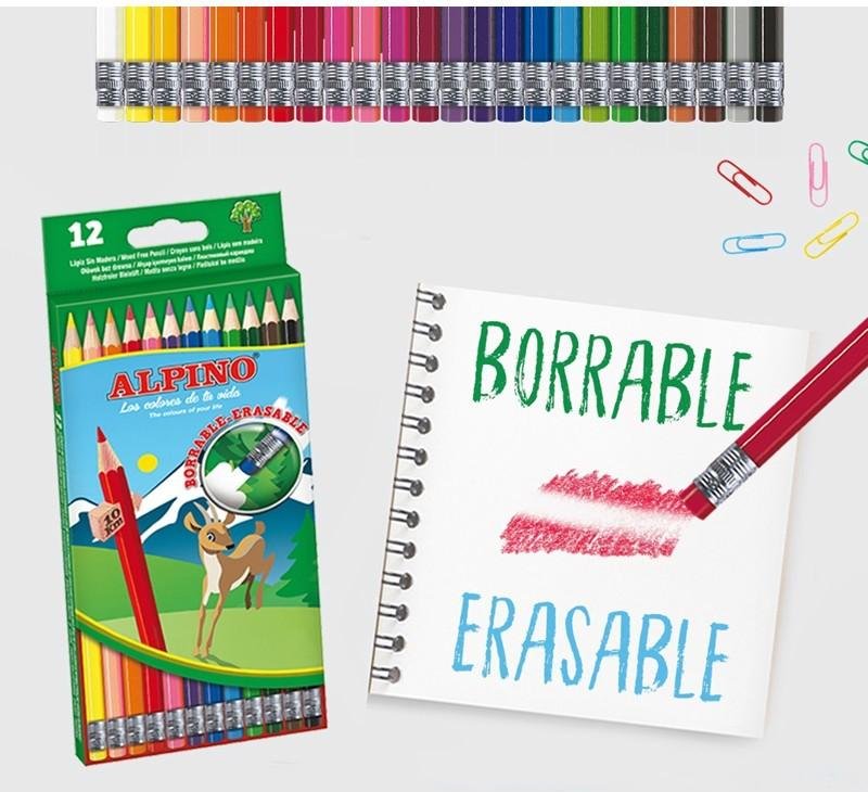 Estuche de 12 lápices de colores con mina borrable y goma de borrar del mismo color incorporada. Corrige los pequeños errores sin esfuerzo y sin dejar rastro. Gama de 12 colores brillantes con mina resistente a la rotura.