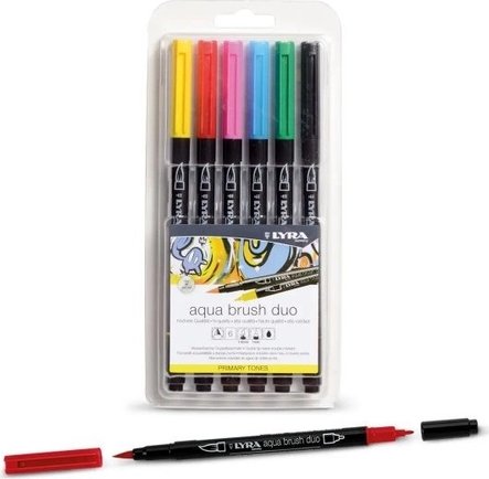 LYRA ofrece a los creativos amantes de la experimentación una línea de rotuladores de doble punta a base de agua para el diseño gráfico y el dibujo artístico. Los colores crean un efecto de acuarela y se mezclan perfectamente. La punta fina está diseñada para realizar trazos precisos, contornos y detalles. La punta flexible y elástica está pensada para una aplicación amplia y suave del color y las letras. Disponible en 6 colores primarios.