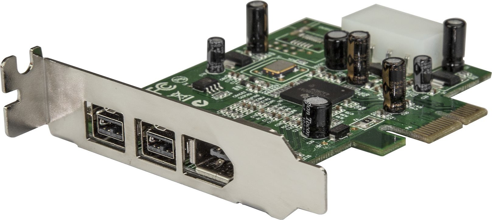 Esta tarjeta PCI Express de 3 puertos FireWire esta equipada con un soporte de perfil bajo para ser instalada en ordenadores de factor de forma pequeño e incluye un soporte de tamaño completo opcional para gabinetes de PC de tamaño estándar. La tarjeta adaptadora FireWire se puede instalar en una ranura PCIe con el fin de añadir dos puertos IEEE1394b (FireWire 800 – 9 pines) y un puerto IEEE1394a (FireWire 400 – 6 pines), brindando compatibilidad con un amplio rango de dispositivos FireWire (p. ej. cámaras grabadoras de vídeo digital, discos duros externos, cámaras digitales, etc.) La tarjeta con dos puertos FireWire 800 y un puerto FireWire 400 ofrece un chipset PCI Express nativo (chip único) lo que se traduce en un desempeño más fiable, rápido, eficaz y económico que el de las tarjetas de expansión que utilizan un chip “puente”.